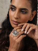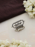 trueBrowns Silver Tone Pearl Drop RingDescription Silver rectangular pearl drop ring with adjustable slip-on closure. Style it with a Kurta, Co-ord...