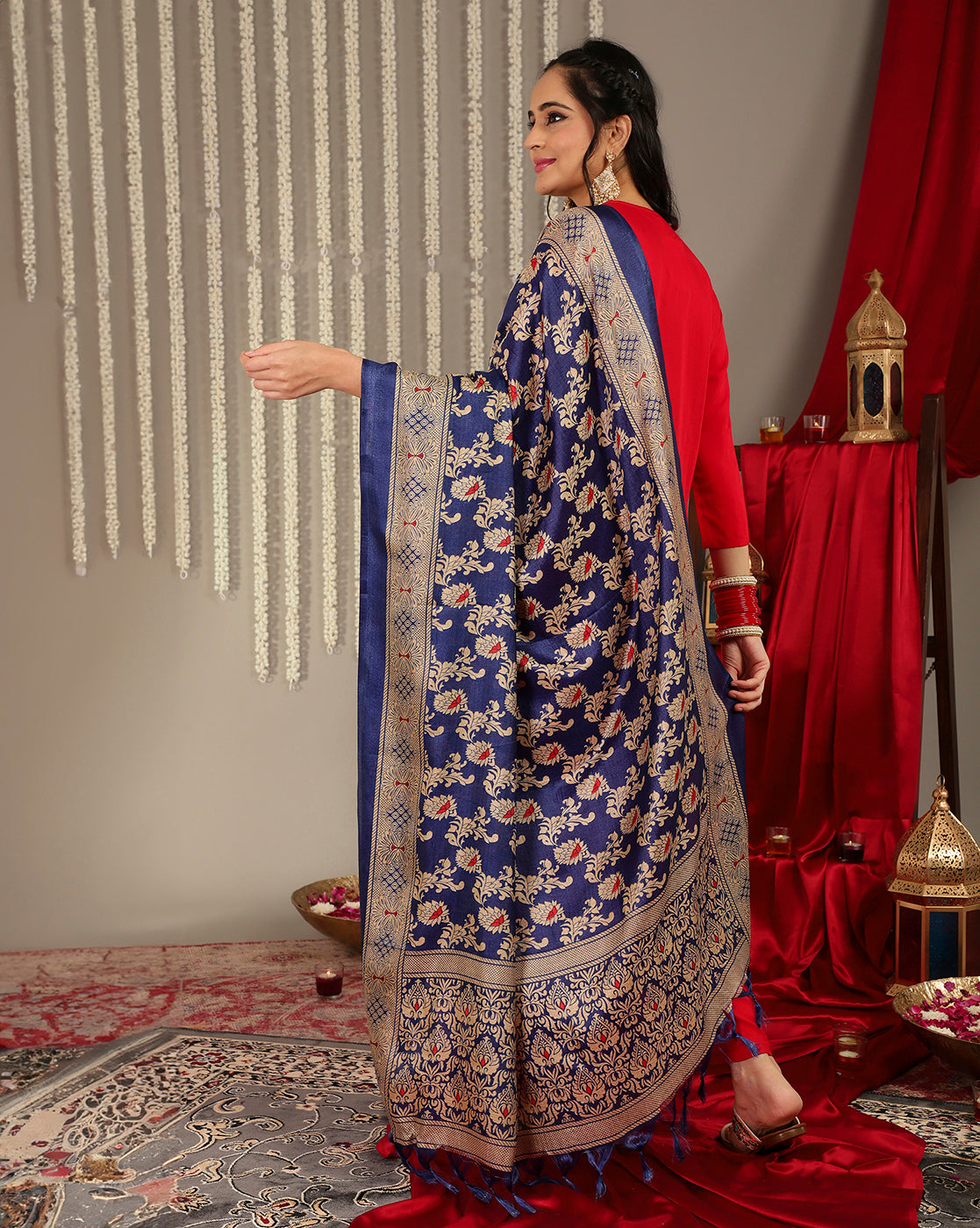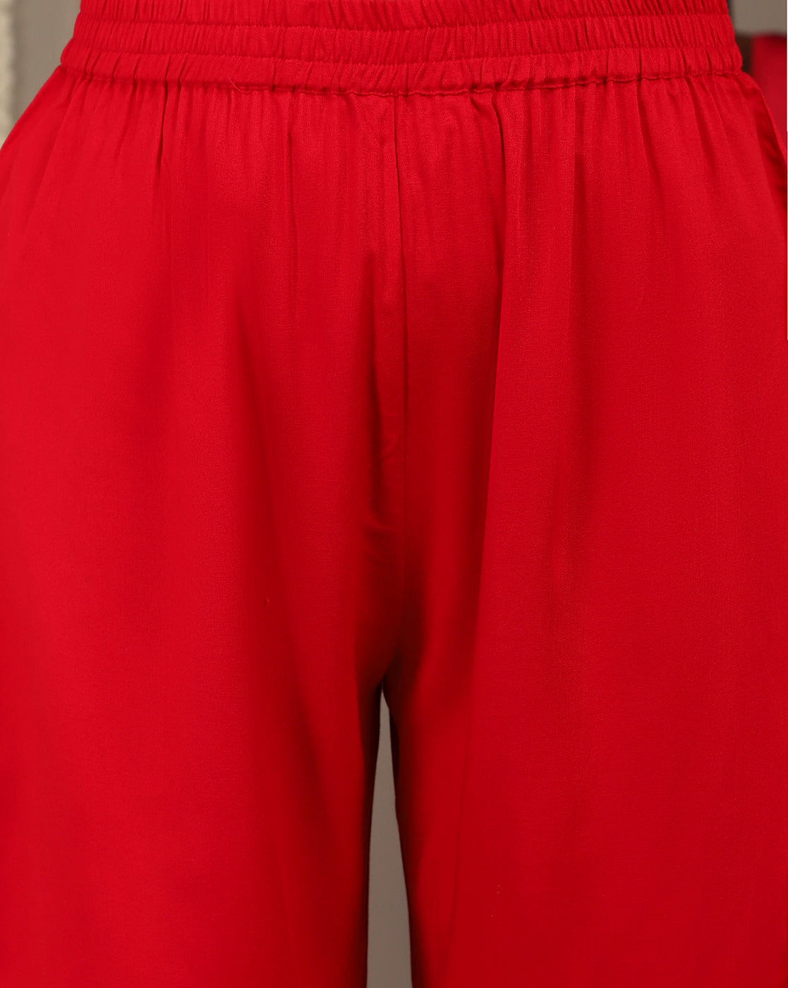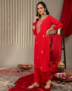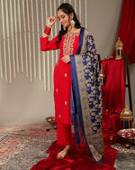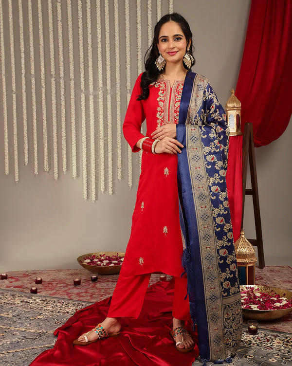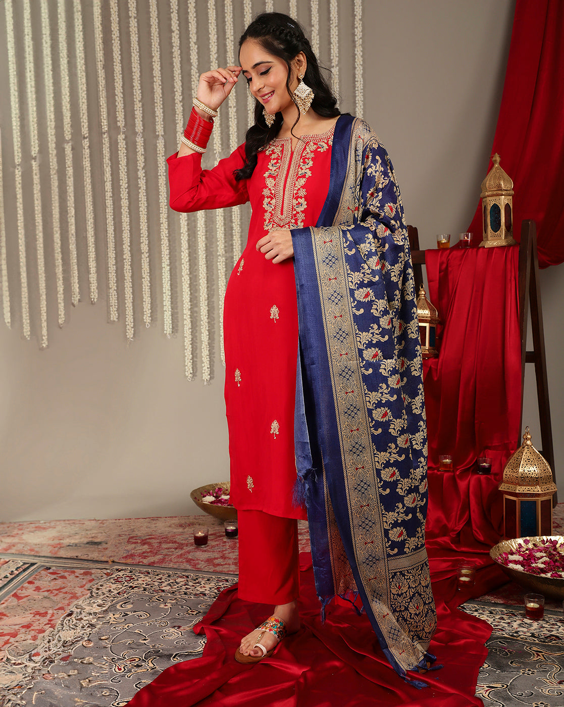 Red Placement Design Embroidered Kurta, Round Neck With Slit, Three Quarter Sleeve, Straight Kurta Paired With Tonal Bottom And Contrast Bhagalpuri Dupatta