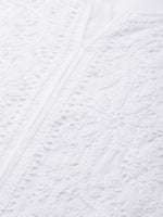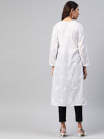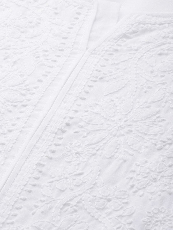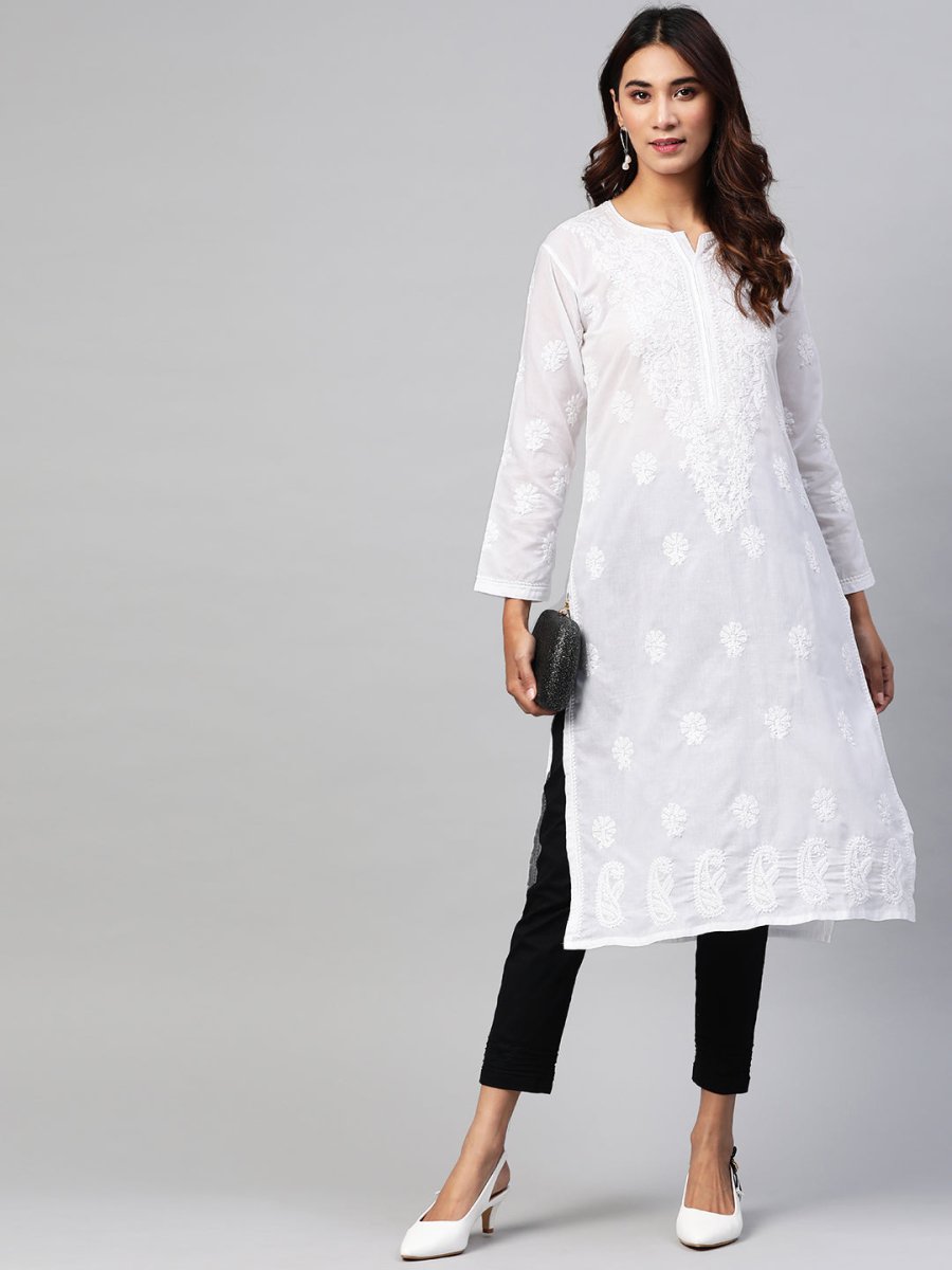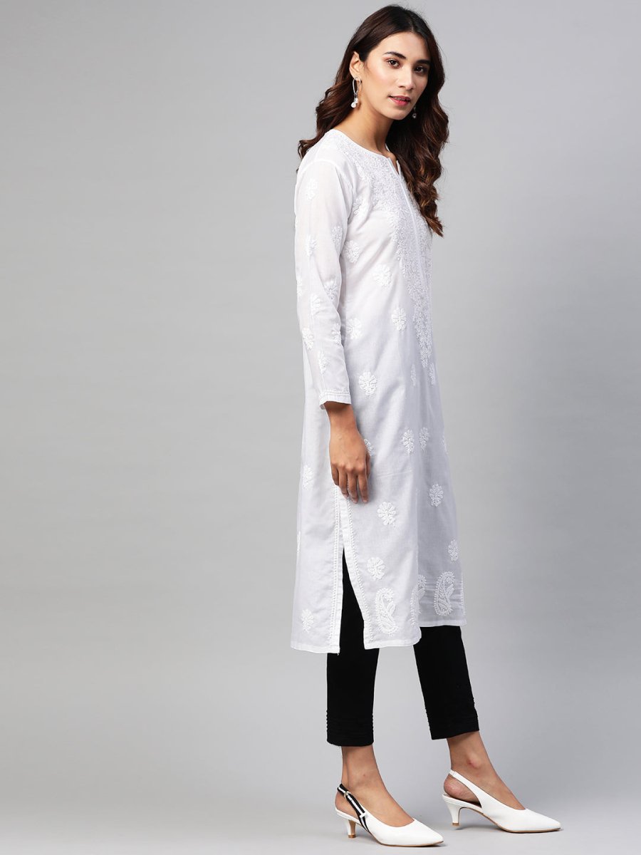 White chikankari embroidered?straight calf length kurta, has a round neck, three-quarter sleeves, straight hem, side slits