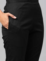 Black solid trousers, has partially elasticated waistband, zip closure, 2 pockets