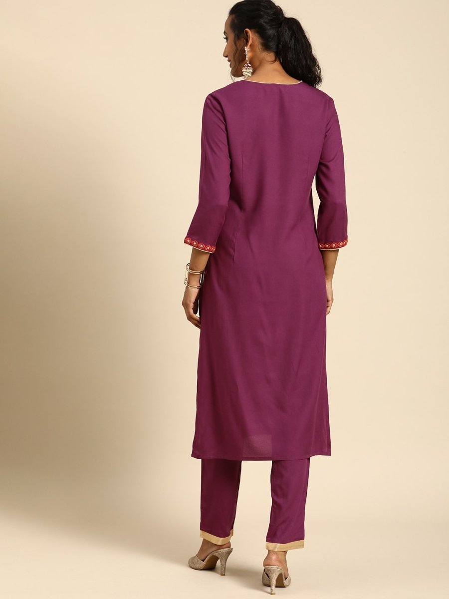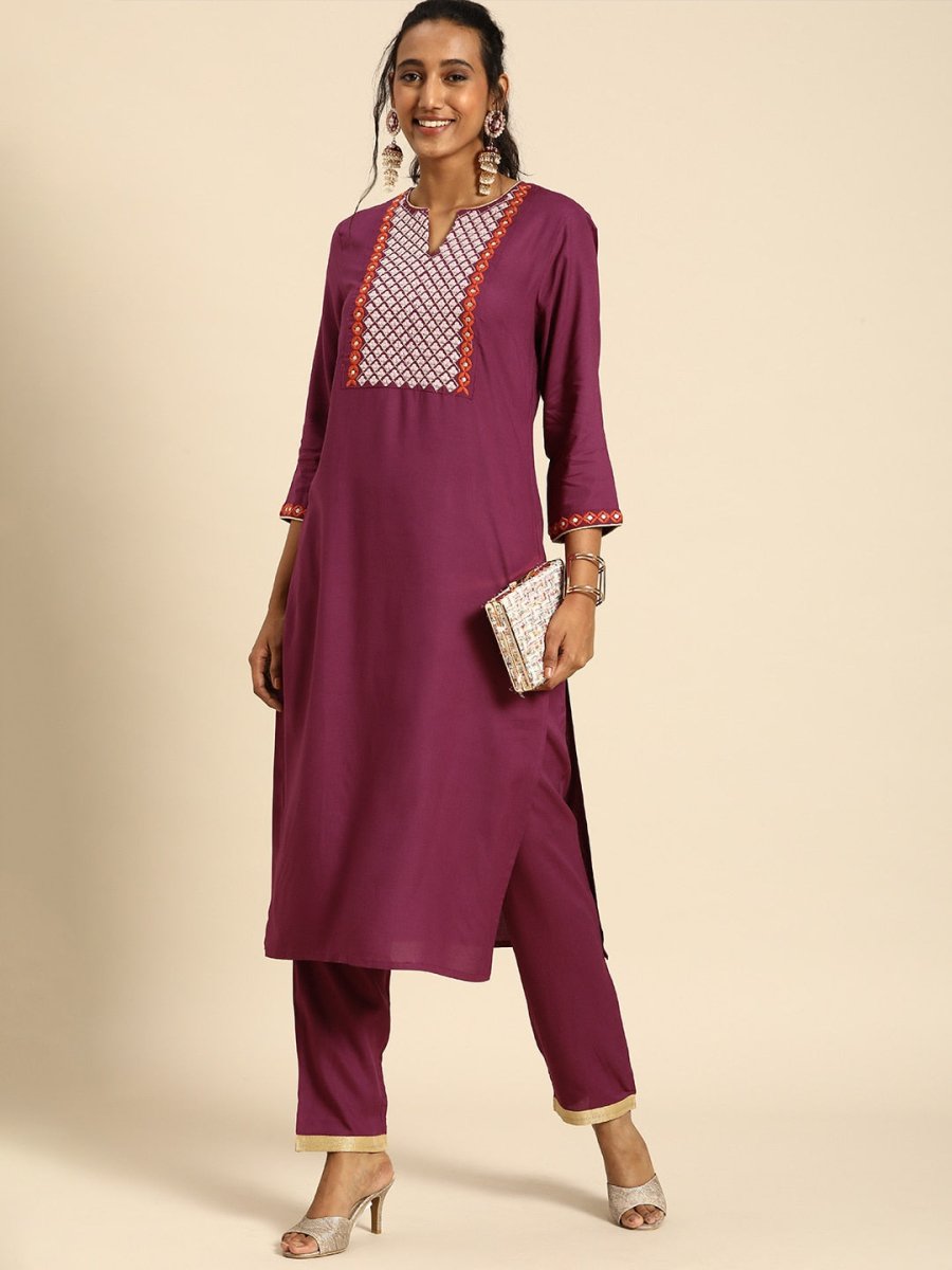All About You Women Purple Ethnic Motifs Yoke Design Regular Thread Work Kurta with Trousers Product Details Purple yoke design Kurta with Trous...