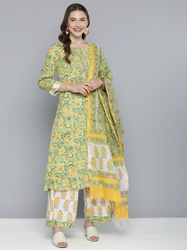HERE&NOW Floral Printed Regular Pure Cotton Kurta with Palazzos & With Dupatta Product Details Green printed Kurta with Palazzos with du...