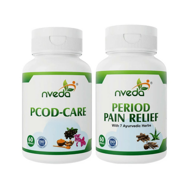 Nveda PCOD Care Capsules and Period Pain Relief Capsules Combo This Combo Contains: 1. Nveda PCOD Care Capsules - 60 caps 2. Nveda Period Pain Rel...