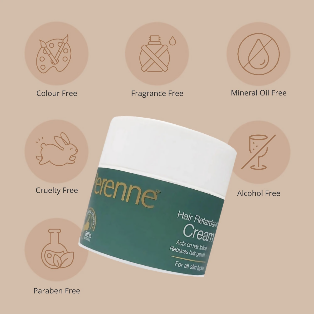 Perenne Hair Retardant Cream offers a breakthrough in painless hair reduction. Clinically proven and formulated with natural ingredients, this cream acts directly on hair follicles, effectively delaying hair regrowth. It complements various hair removal techniques. Rub thoroughly into the skin, after hair removal techniques like shaving, plucking, tweezing, or cutting.