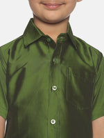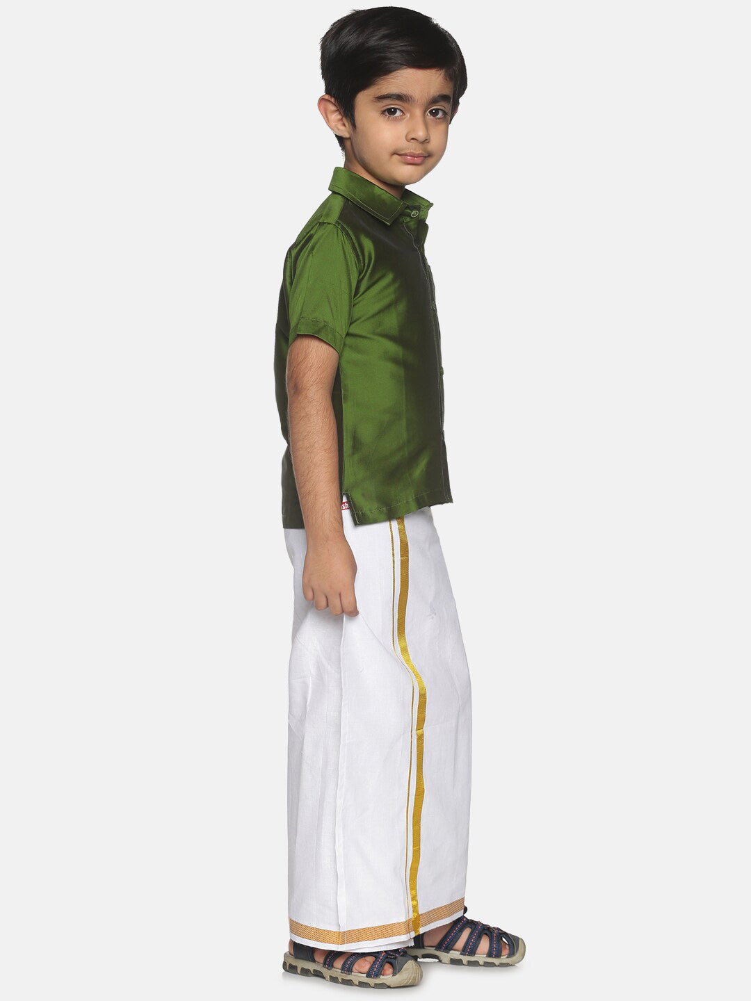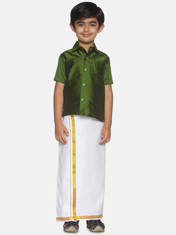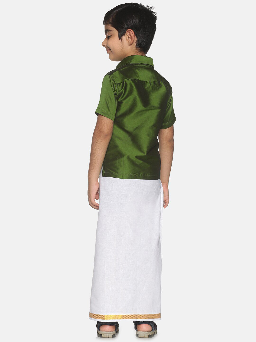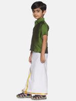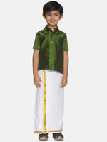 Sethukrishna Boys Olive Green & White Shirt And Veshti Set