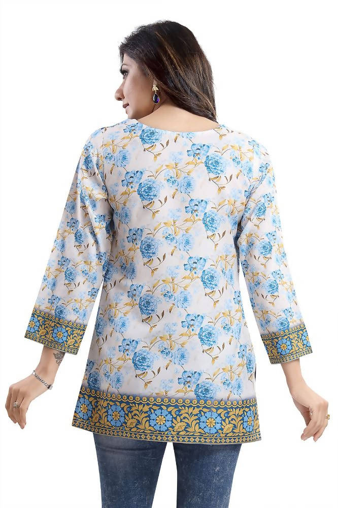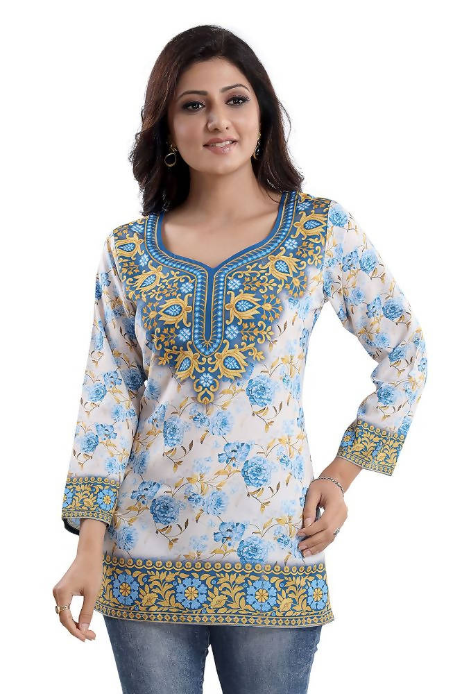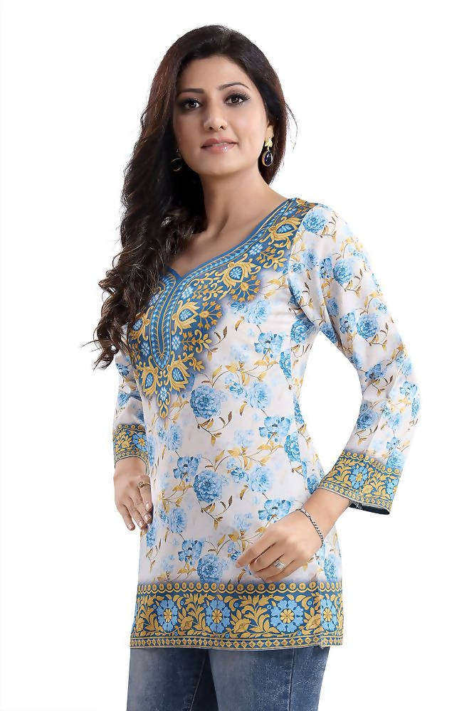 Trying to add an appropriate piece for summer in your wardrobe? Buy this beautiful faux crepe printed short Kurti tunic top exclusively designed by Snehal Creation. The tunic is has got an alluring sweetheart neck along with big detailings as well. The color combination of blue and yellow flowers on white stands out perfectly. It has got full sleeves thus will protect skin from heat and tanning. The material of faux crepe is very soft on the skin and looks very presentable as well.