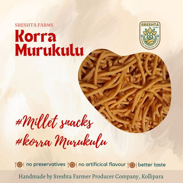 Sreshta Farms Korra MurukuluAbout the Product:Delicious and crunchy snack made from foxtail millet flour. Perfect for festive seasons and family ga...