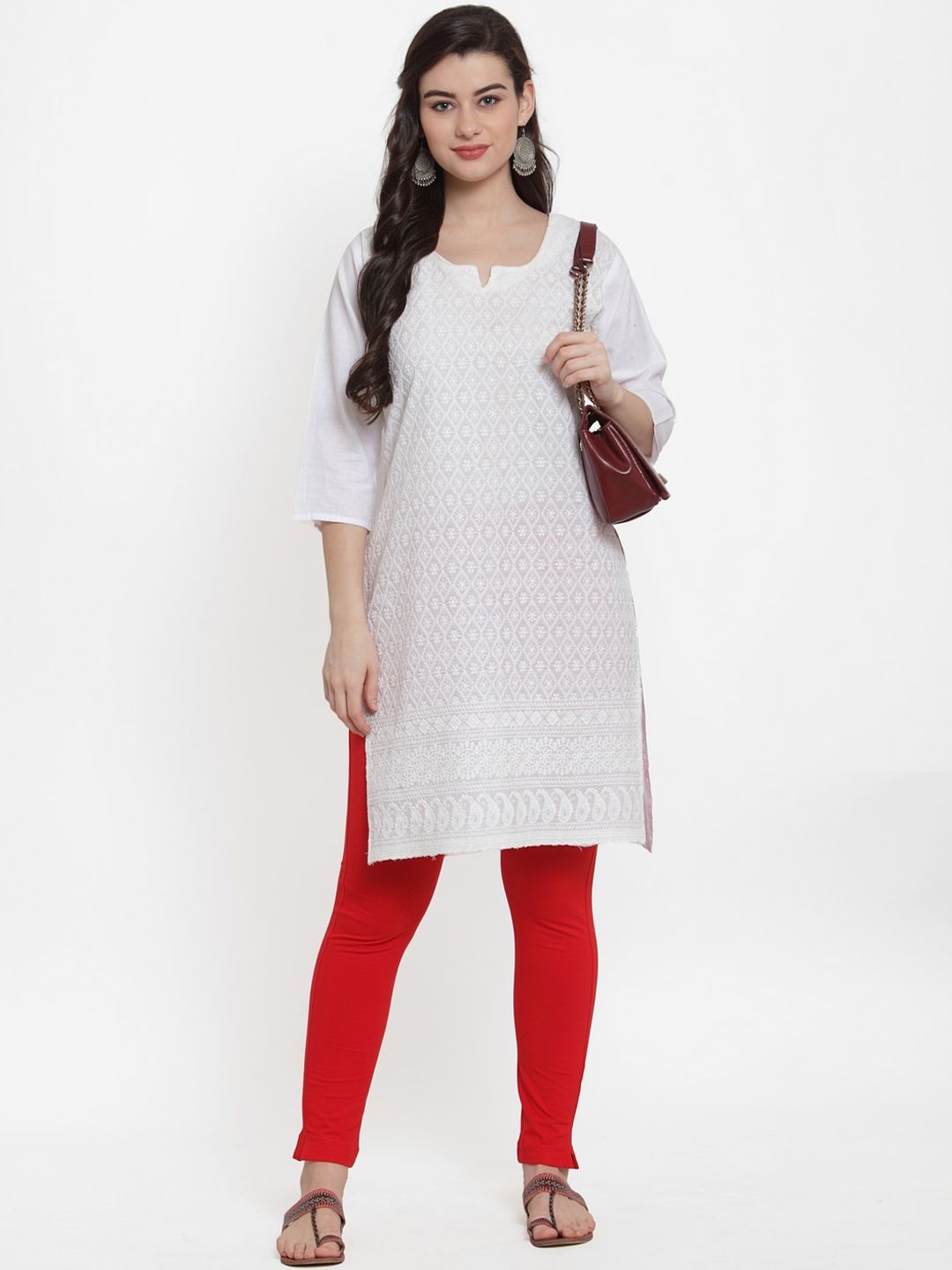 Pack of two solid ankle-length straight-fit leggings in red and white, each has an elasticated waistband, two pockets and slip-on closure