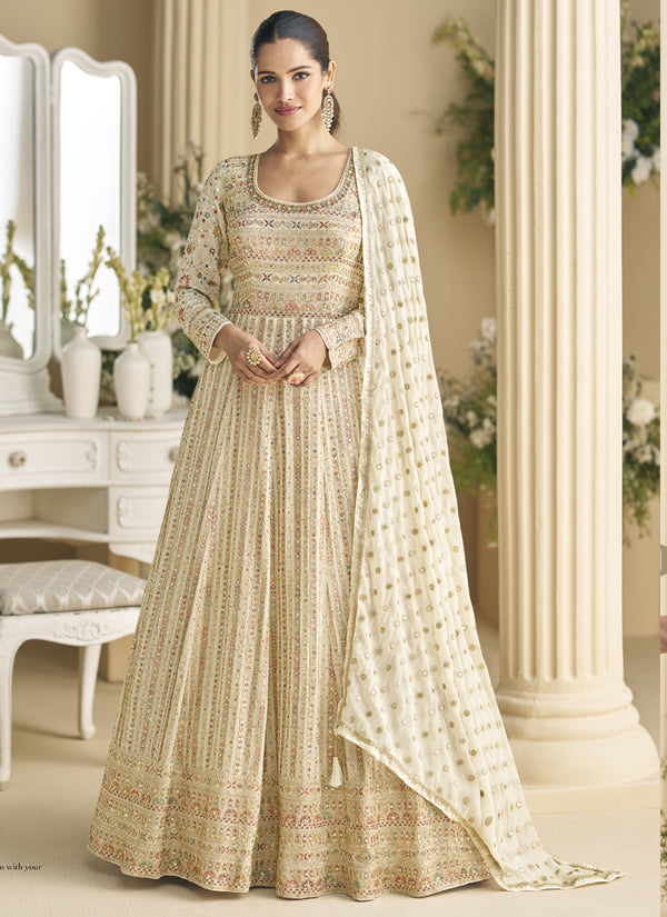 Vegaa Fashion Off White Georgette Embroidered Seroski Zarkan Anarkali Suit