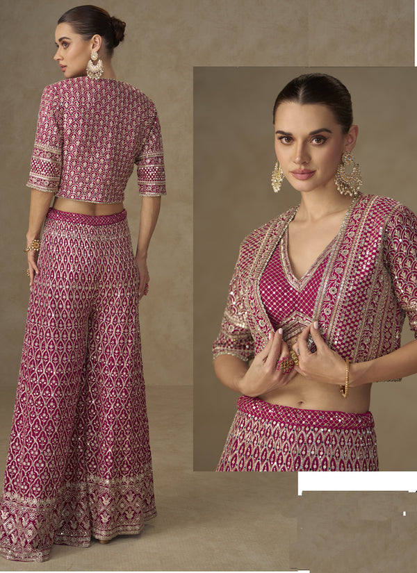 Vegaa Fashion Pink Georgette Embroidered & Hand Work Jacket Style Co-Ord SetProduct Details:Wedding suit is the perfect choice for Indian festi...