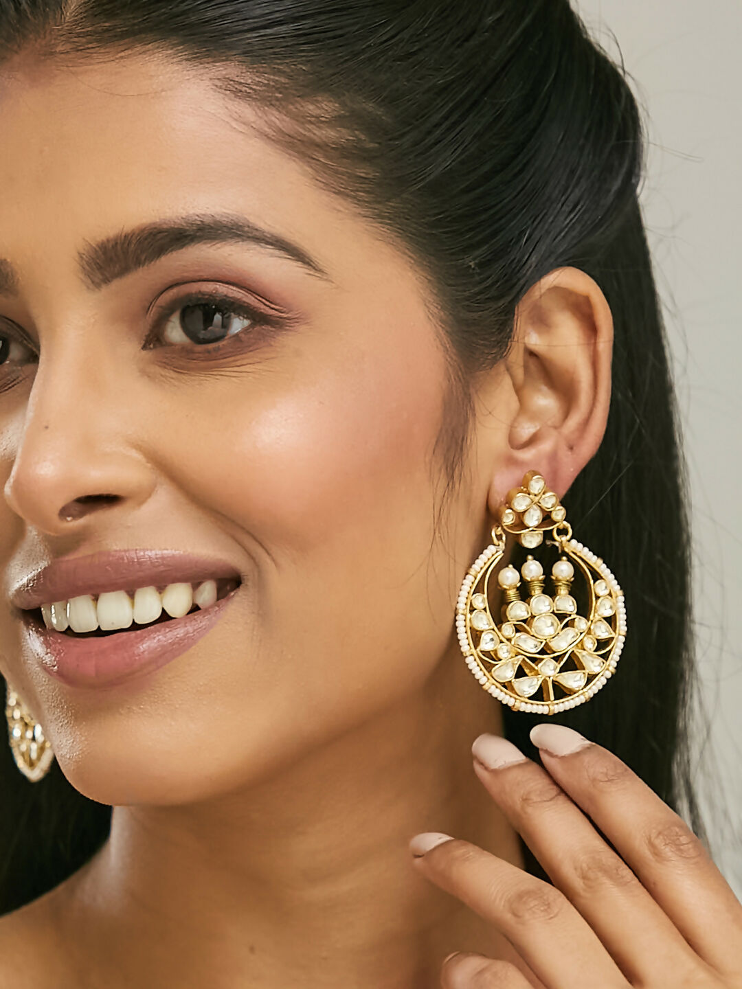 Nuyug 22K Gold-Plated Elegant Kundan Stone Studded & Pearl Beaded Chandbalis