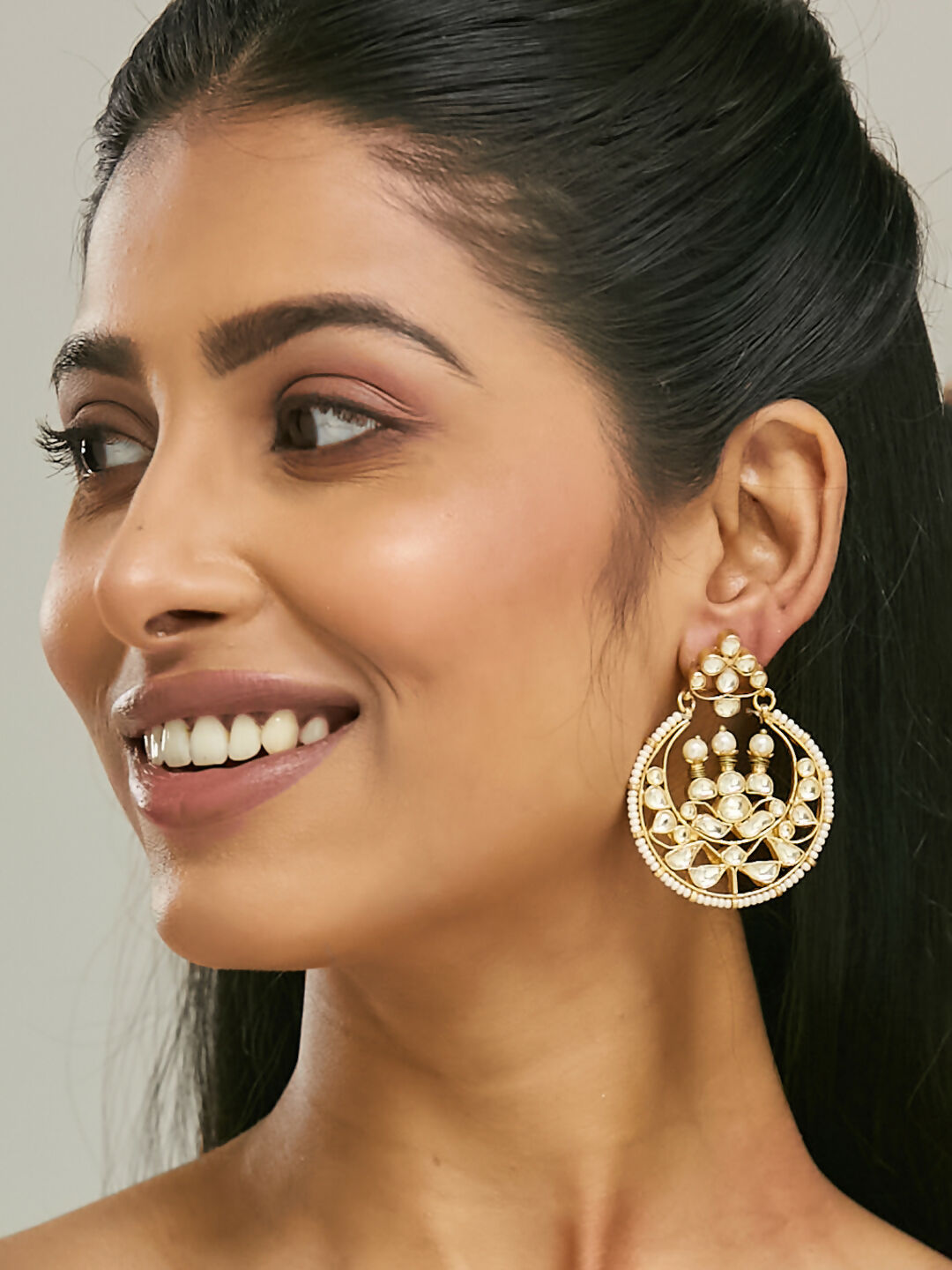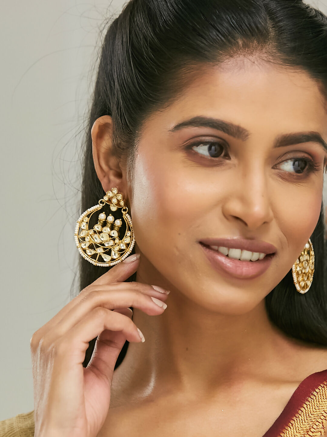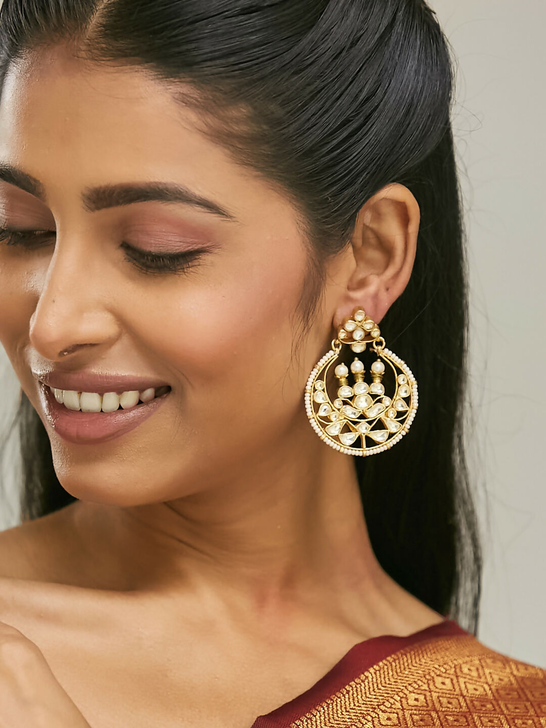 Nuyug 22K Gold-Plated Elegant Kundan Stone Studded & Pearl Beaded ChandbalisAbout the product:22K Gold-plated, white crescent kundan chandbalis...