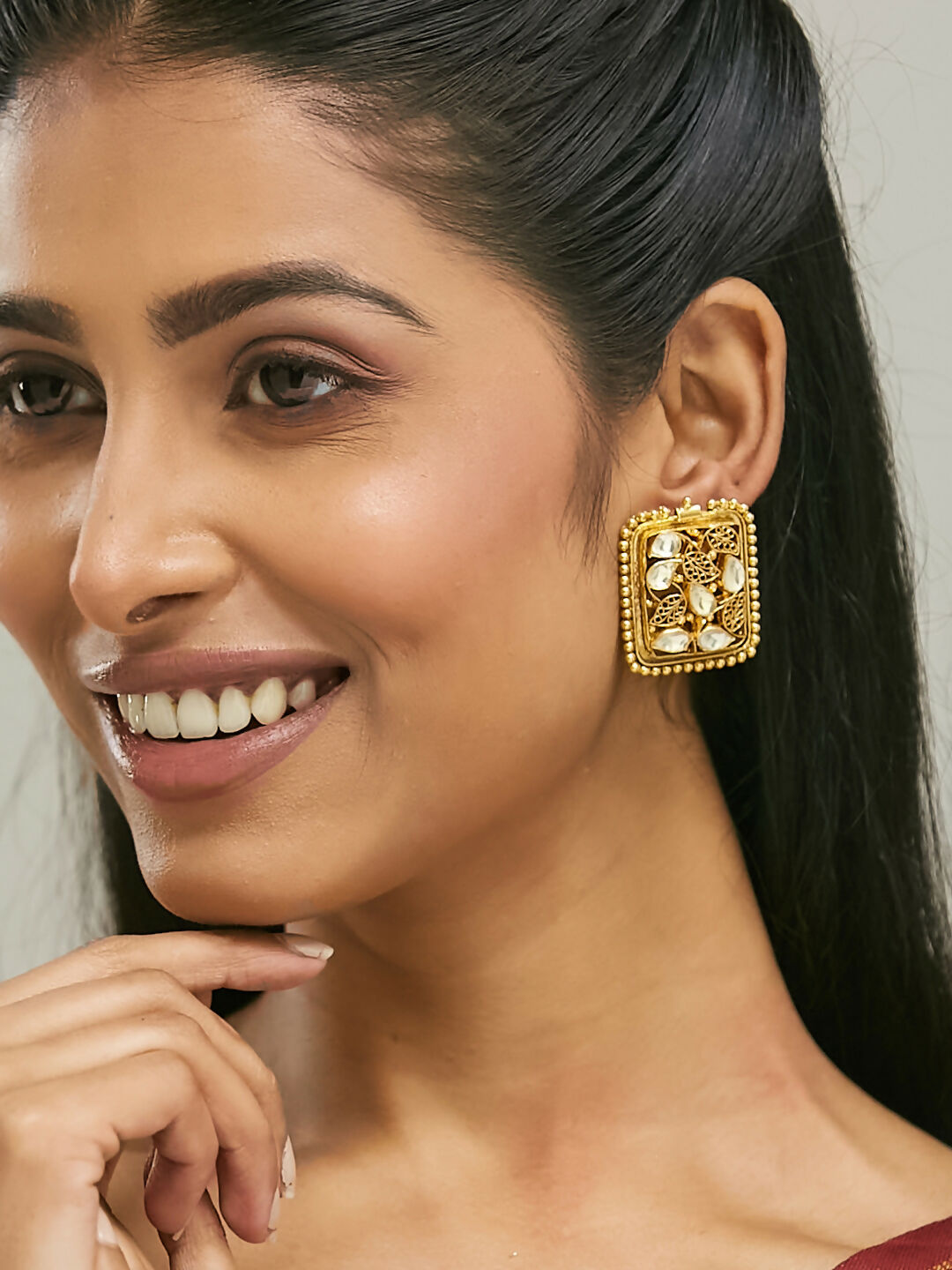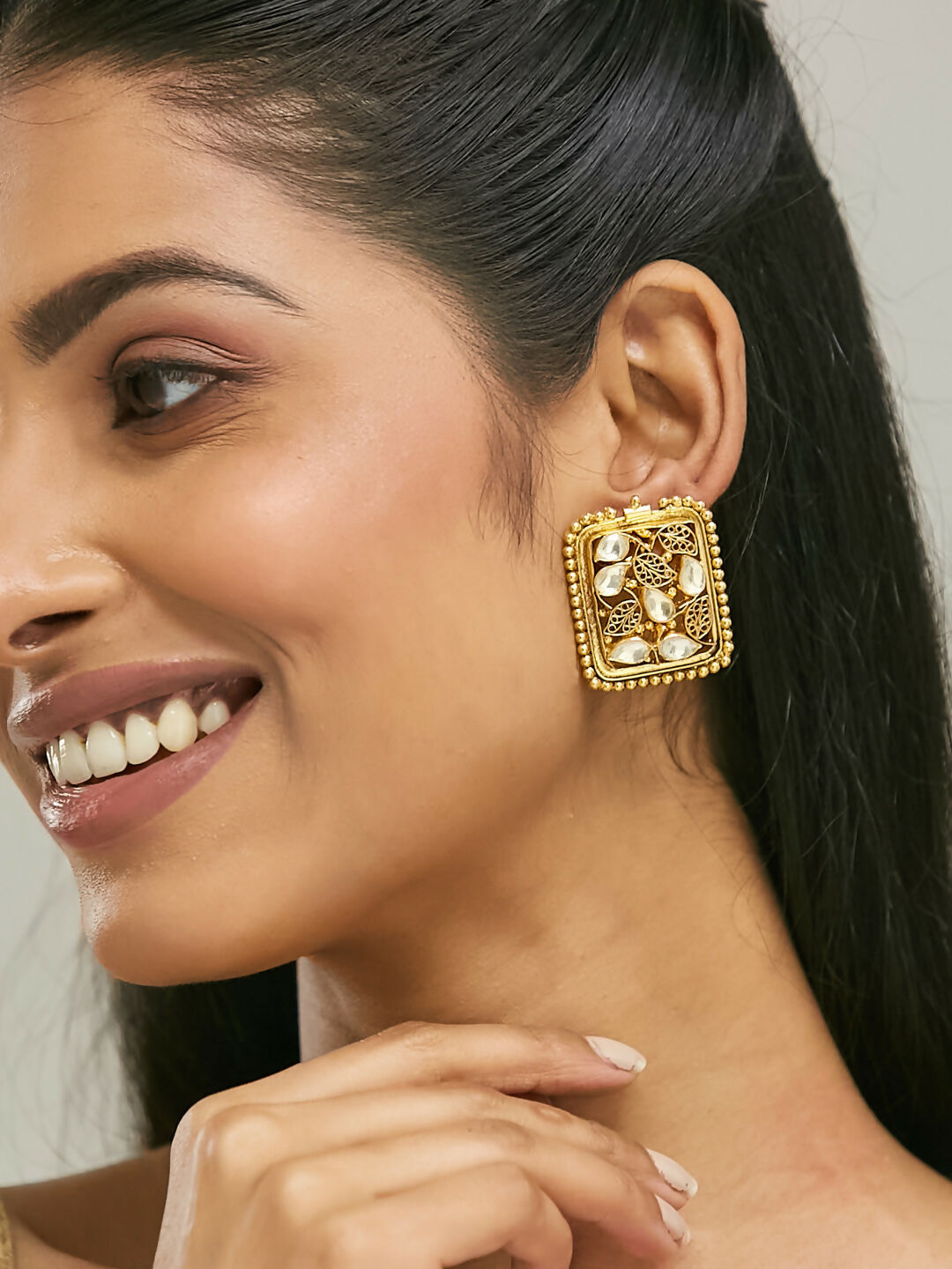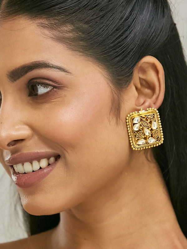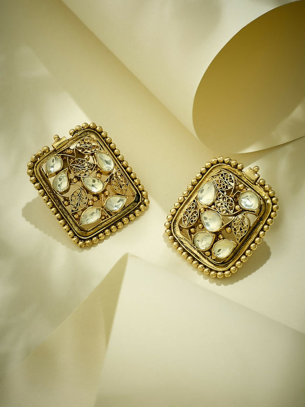 Nuyug 22K Gold-Plated Kundan & Filigree Concept Rectangular Leafy Studs