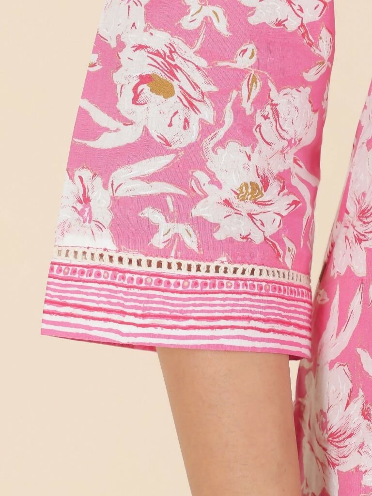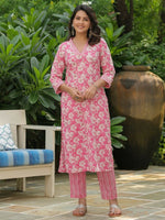 Aramya Straight Soft Cotton Floral Print Women's Kurta Set - Pink