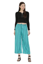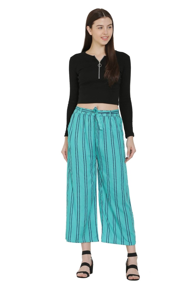 It is made of Rayon Fabric. Turquoise color with White Stripped. Belt include and Two pockets in this Palazzo.This Palazzo Minimum waist size is 24 inch and Maximum 38 inch. Light weight and comfortable wearing with High Waist Wide Leg Stretchy Palazzo Pants.Perfect finishing and good quality Palazzo. Keep your style breezy and chic in these palazzos.