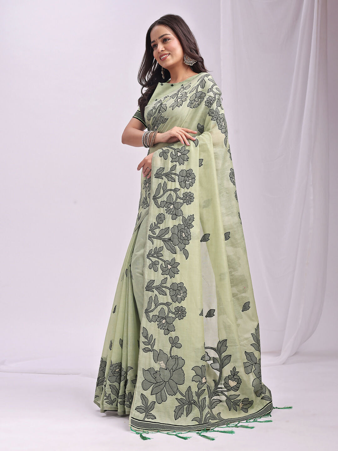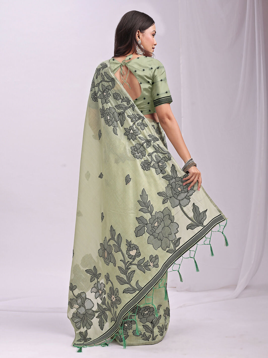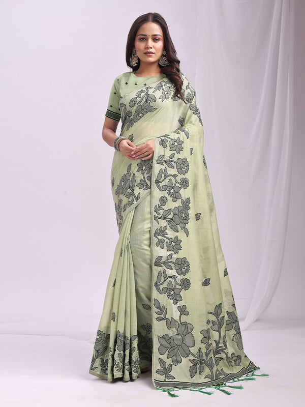 Astita Kashira Light Green Linen Cotton Saree Color : Light Green Saree Fabrics : Linen Cotton Blouse Fabrics : Linen Cotton Saree Length : 5.5...