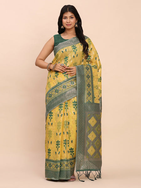Astita Linen Cotton Yellow Saree Saree Color: Yellow Saree Fabric: Linen Cotton Blouse Fabric: Linen Cotton Blouse Color: Green Legal Disclaime...