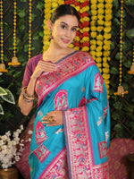 Astita Silk Sky Blue Saree Saree Color: Sky Blue Saree Fabric: Silk Blouse Fabric: Silk Blouse Color: purple Legal Disclaimer: Product color ma...