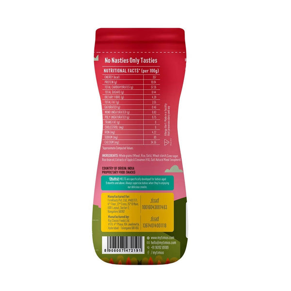 Timios Melts Apple and Cinnamon healthy snacks are delicious whole grain snacks for hungry little tummies or busy tiny fingers. Introduce your kids to new tastes and textures with tasty Timios Melts. These are 100 % natural, non-fried whole grain snacks and made with natural fruit & vegetable extracts, these are completely free from artificial colors, flavors or preservatives, and dissolves easily in your baby's mouth. Give a tasty & healthy touch in every bite. Delicious star-shaped snacks made exclusively for your babies. Timios Melts are made with wholesome ingredients, keeping in mind the appetite and nutritional needs of your baby. No additives, no coloring, and No-nonsense - these Melts are seasoned with natural fruits, vegetables, and mild spice powders.
