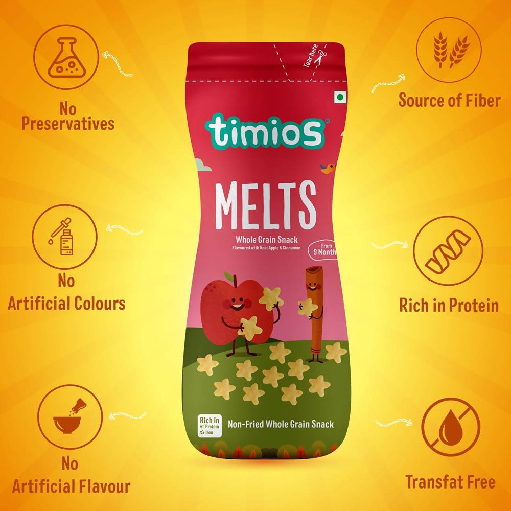 Timios Melts Apple And Cinnamon Finger Food For Babies: 50 gmTimios Melts Apple and Cinnamon healthy snacks are delicious whole grain snacks for hu...