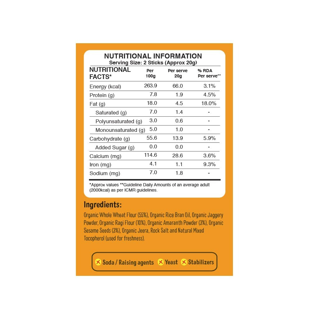 Organic Wheat Flour (54.4%), Organic Rice Bran Oil (15%), Organic Jaggery Powder (13%), Organic Ragi Flour (10%), Organic Amaranth (3%), Organic Sesame Seeds (3%), Organic Jeera (1%), Rock Salt, Natural Mixed Tocopherol (used for freshness)