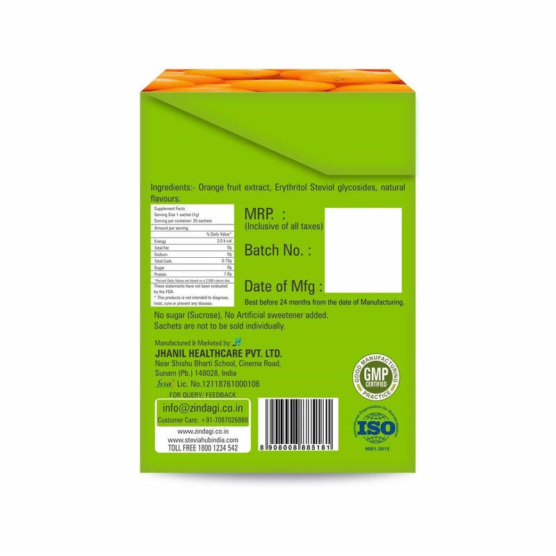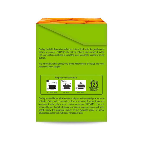 Zindagi Orange Herbal Infusion SachetsIngredients:Orange fruit extract, Erythritol Steviol Glycosides, natural flavors.How To Use:Mix one sachet of...