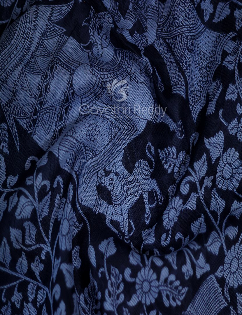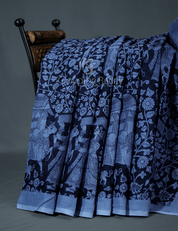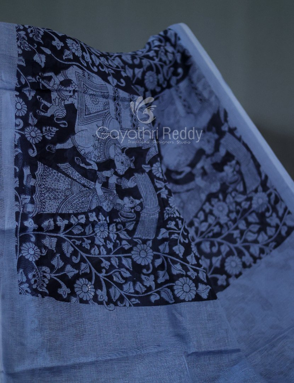 SAREE : Shades of black and grey colour combination saree with kalamkari print design with pure vegetable dyes all over the saree .