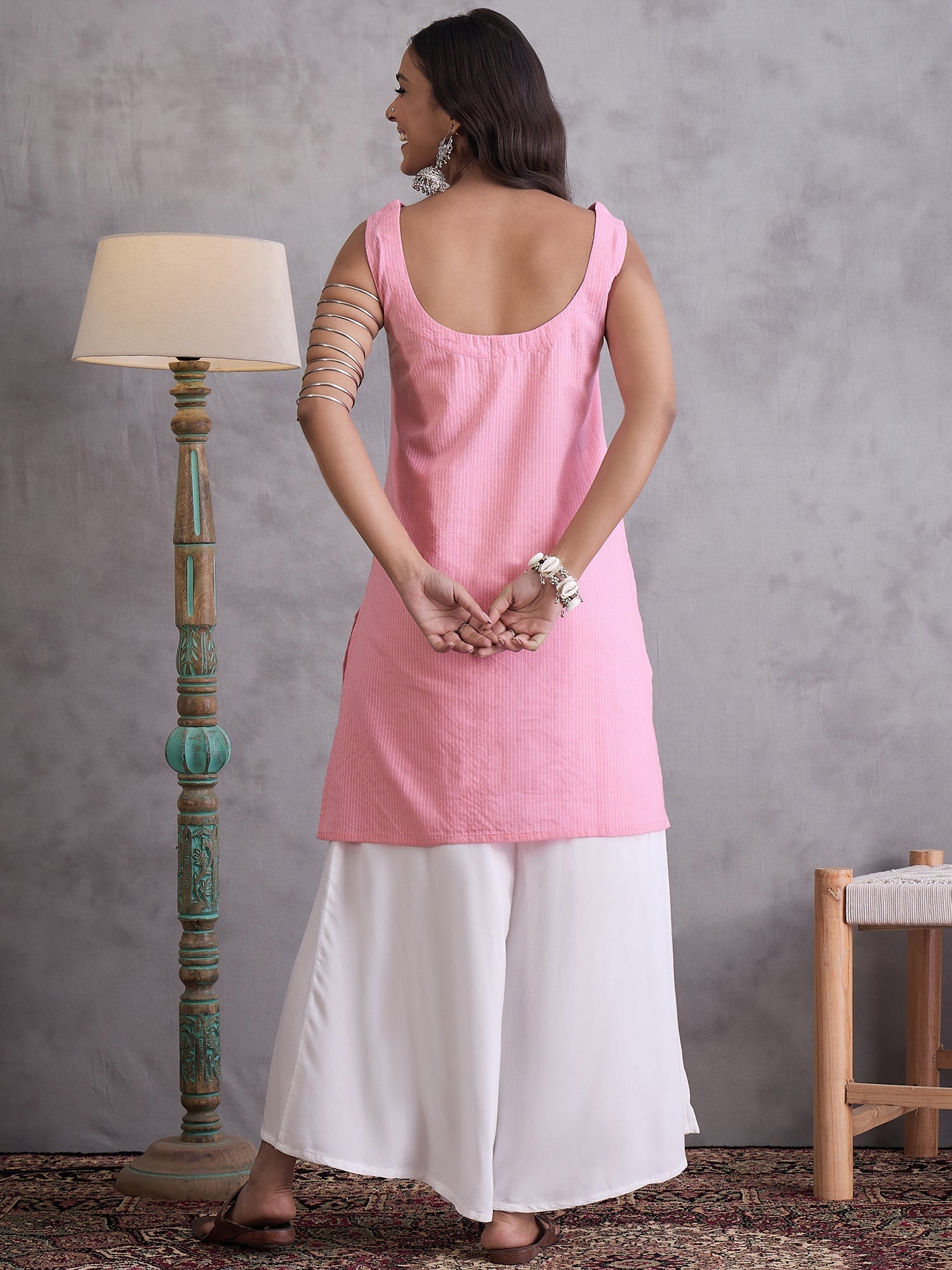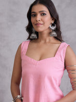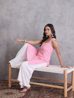 A vibrant bright pink kurta featuring delicate Kantha embroidery and a flattering sweetheart neckline, paired with elegant cream palazzo pants. This set perfectly blends bold color and traditional craftsmanship, making it ideal for festive or semi-formal occasions.