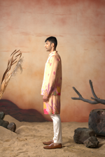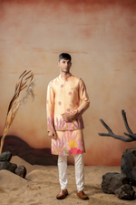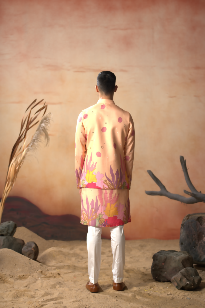 Step into a serene coastal escape with this Coral Sunset Nehru Jacket and Kurta Set. The stunning peachy coral background is beautifully complemented by prints of deep-sea plants, rocks, and scattered sea shells, evoking the natural beauty of the ocean. The soft hues and unique design make this ensemble perfect for those looking to combine elegance with a touch of nature-inspired luxury. Whether you're attending an outdoor event or a casual evening, this jacket and kurta set ensures a stylish, relaxed fit with a standout design.