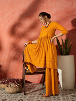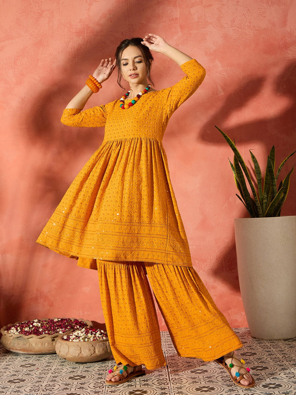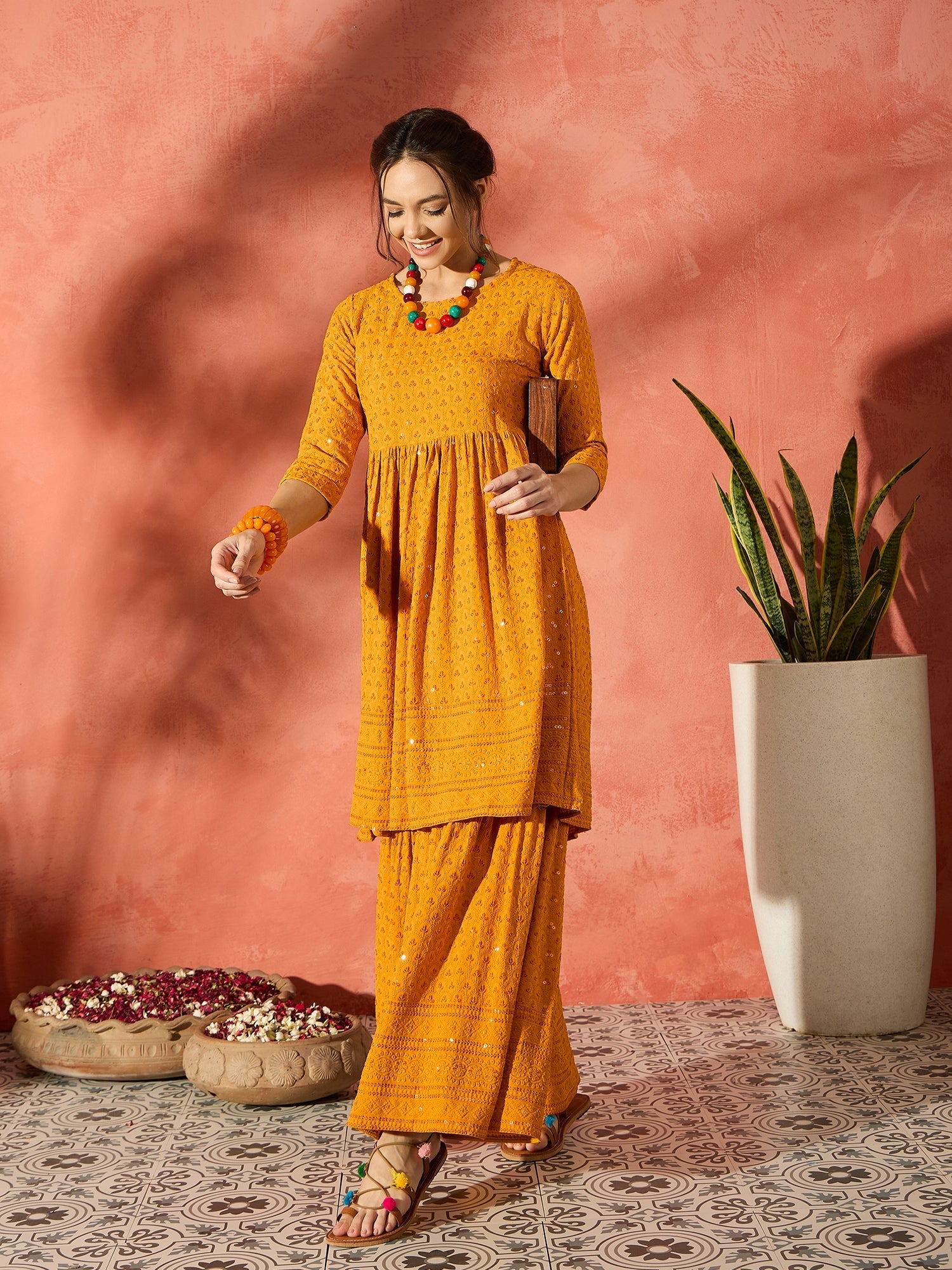 This lovely mustard Chikankari Anarkali kurta sharara set is a perfect blend of tradition and style. The intricate embroidery adds a touch of sophistication, while the soft fabric ensures comfort. Perfect for daytime festivities or family gatherings.