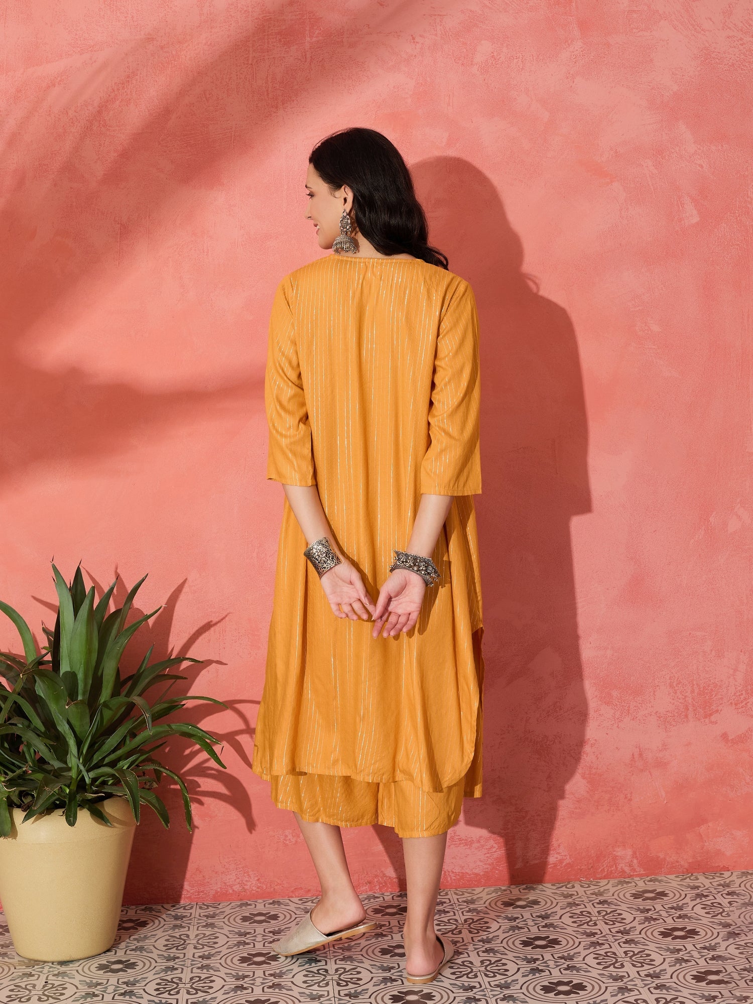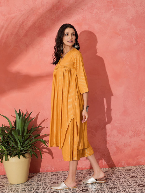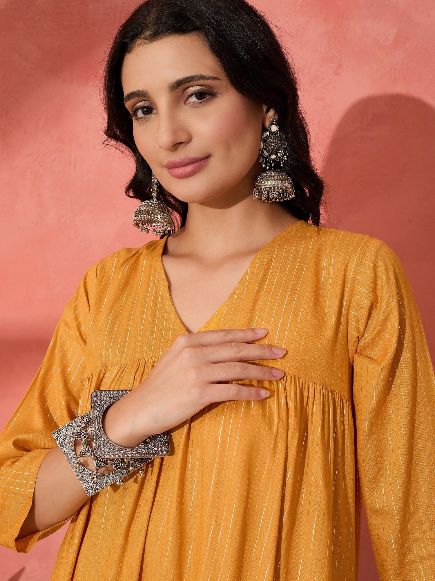 InWeave Mustard Lurex Flared V Neck Kurta Palazzo Set
