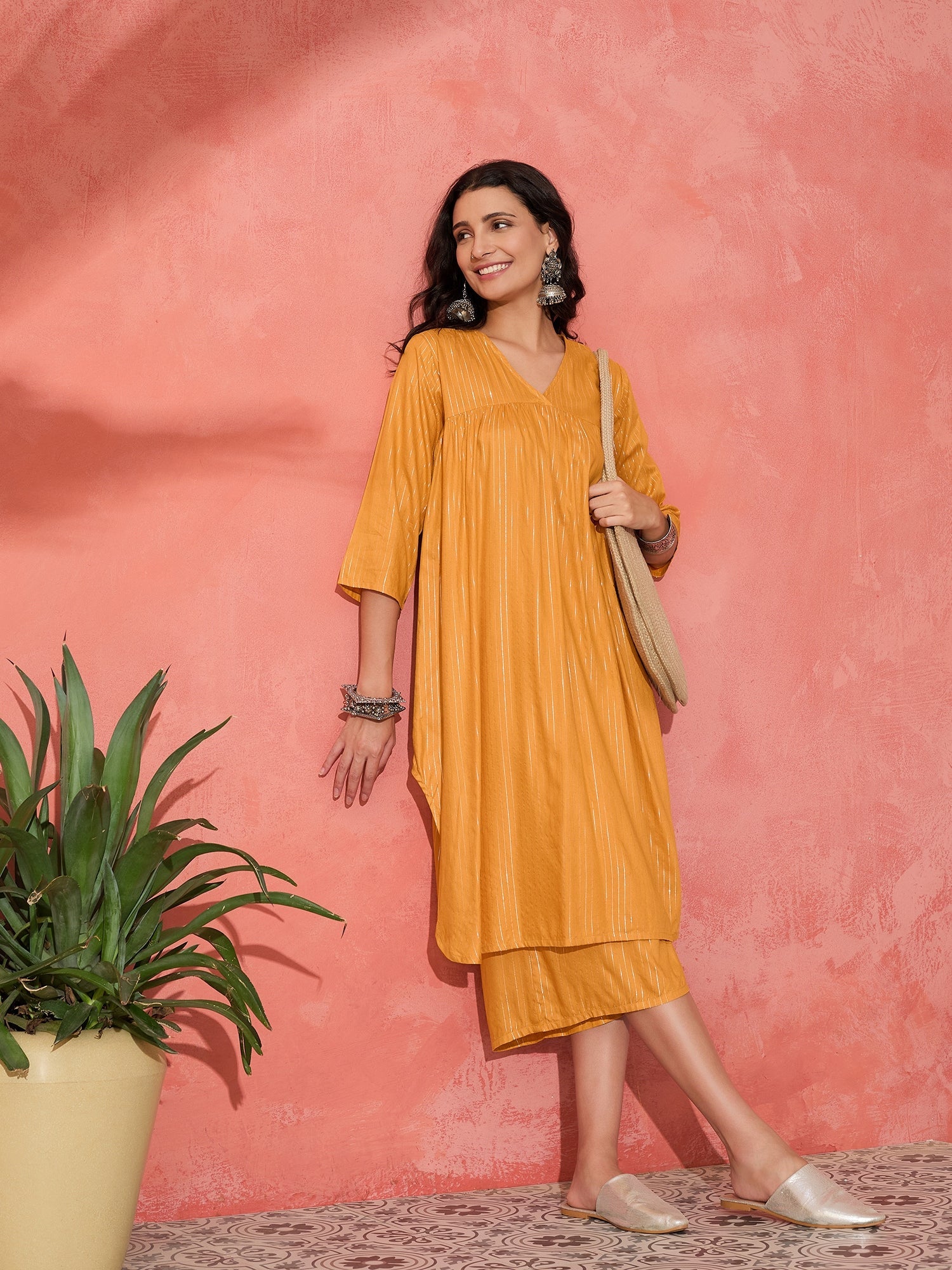 InWeave Mustard Lurex Flared V Neck Kurta Palazzo Set - Distacart