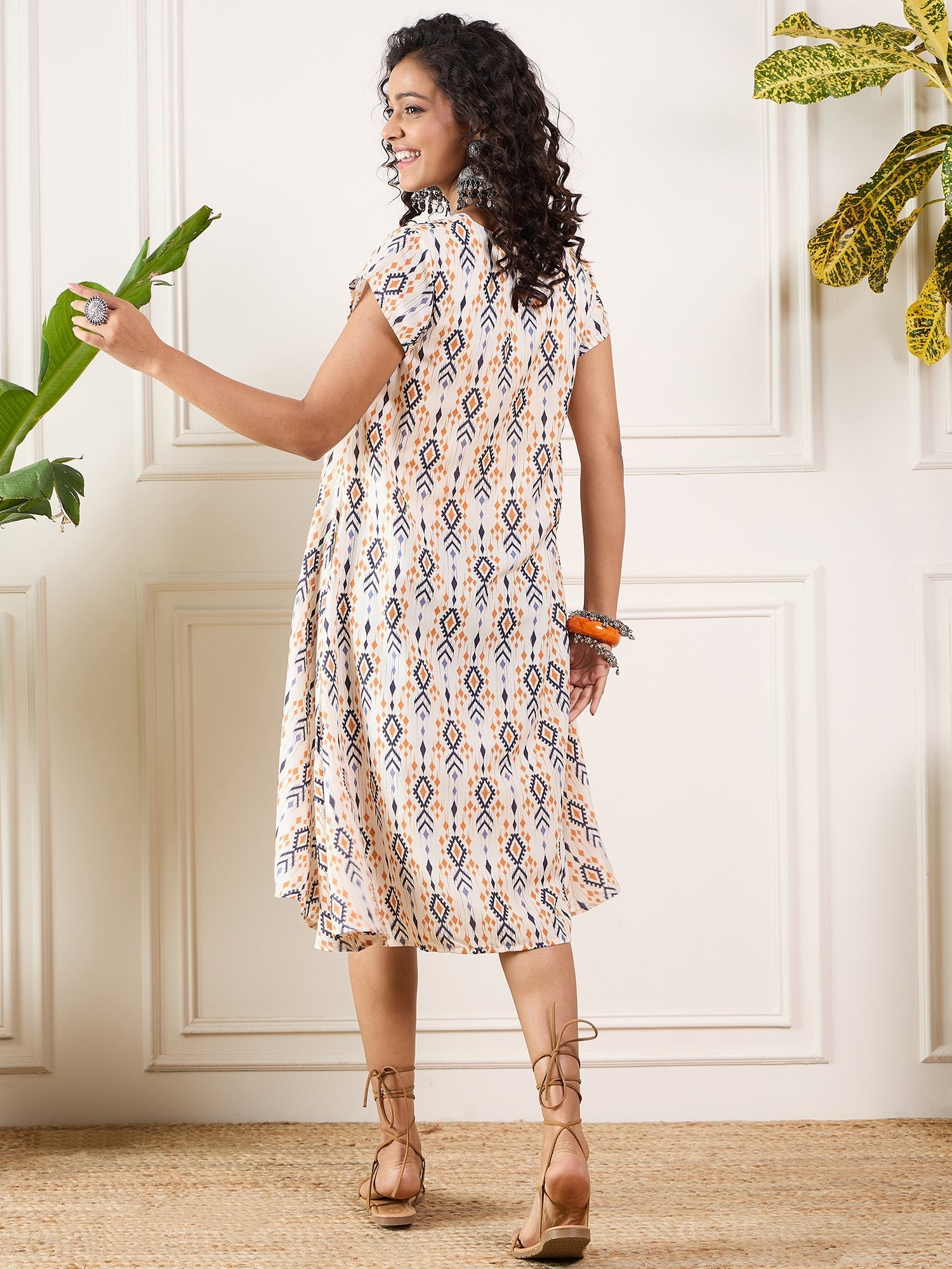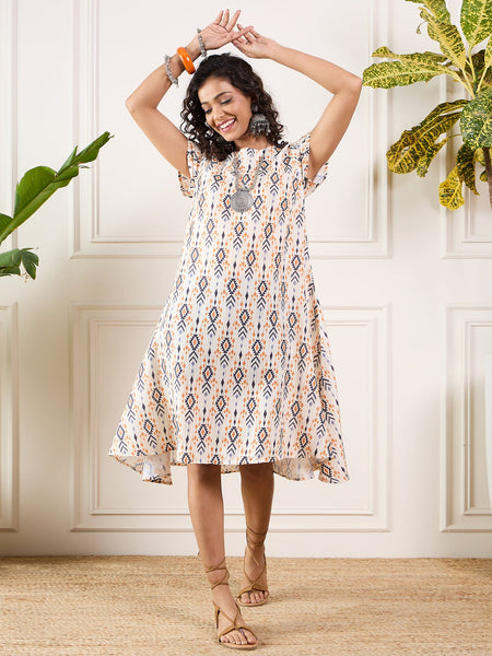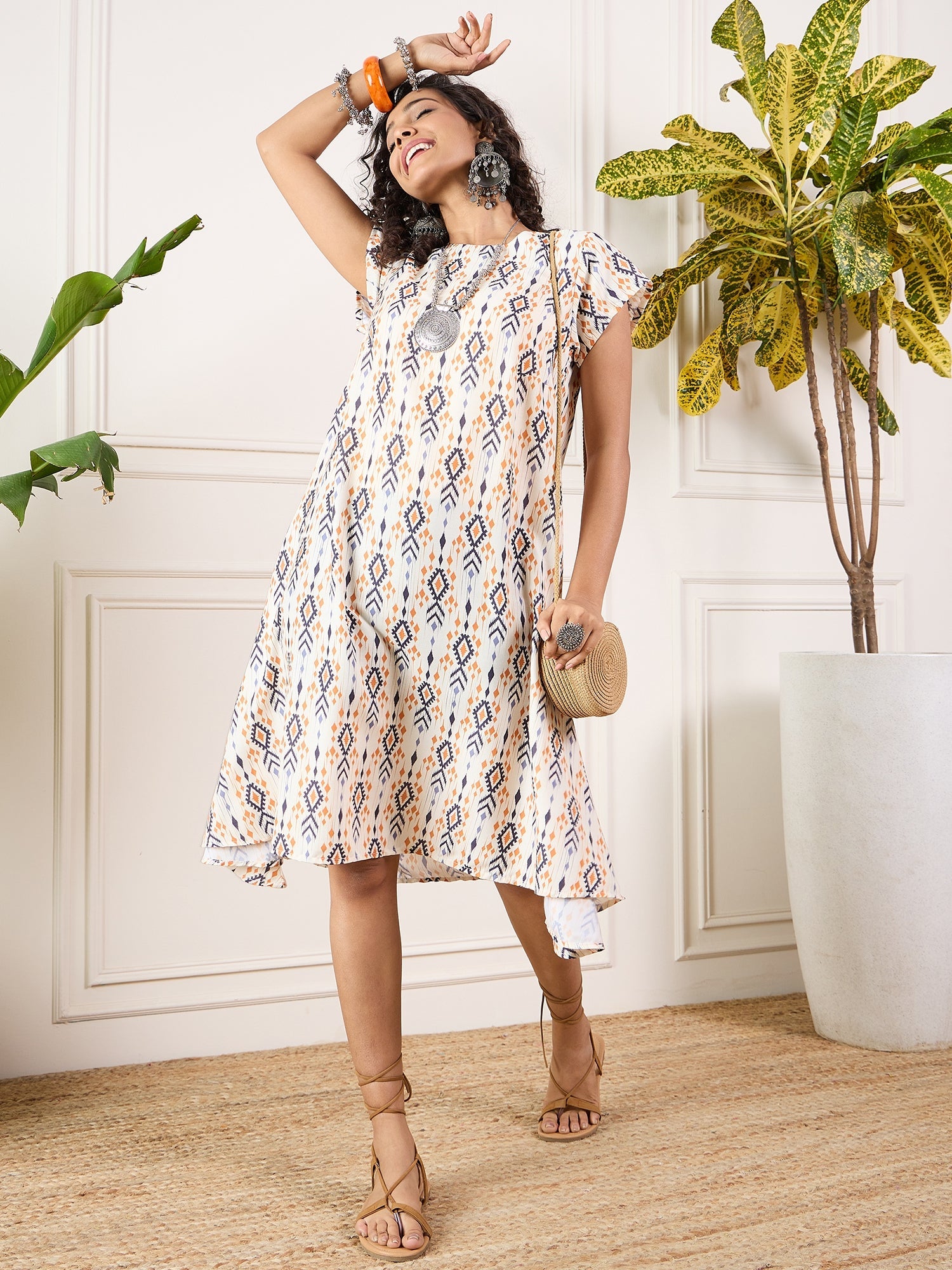 InWeave Off White Orange Black Ikkat Print Round Neck Aline Dress