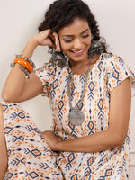InWeave Off White Orange Black Ikkat Print Round Neck Aline DressThe Set is crafted from best of Indian fabrics. Style it with Oxidised jewelery an...