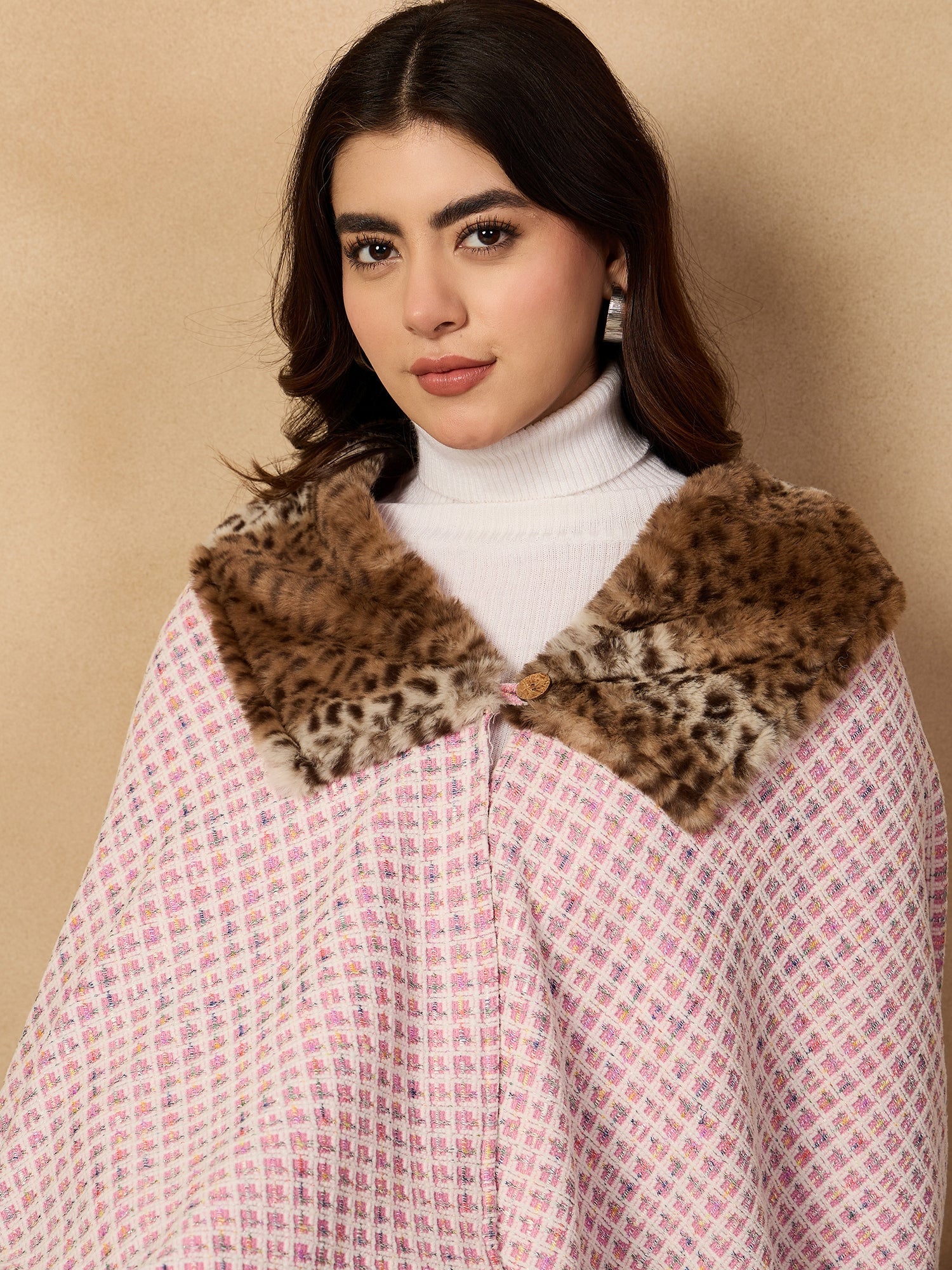 The Pink White Check Acrylic Fur Poncho offers a charming combination of pink and white checkered patterns with a luxurious acrylic fur finish. The cozy and warm fabric ensures comfort, while the high collar adds extra protection against the cold. The poncho's relaxed fit makes it an easy layering piece that can be paired with everything from casual wear to more formal outfits for a stylish, yet laid-back look.