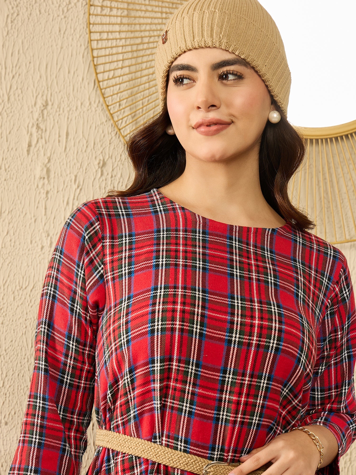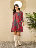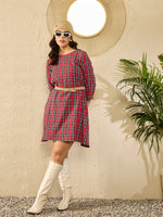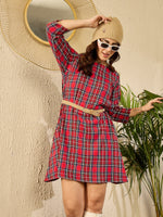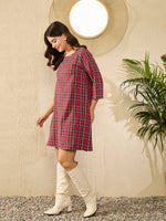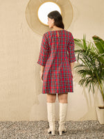 This vibrant Red Green Check R Neck Short Dress features bold checks in red and green. The round neckline adds simplicity to the design, and the short cut creates a fun, flattering silhouette.