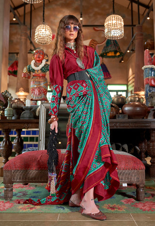 Monjolika Fashion Turquoise and Maroon Silk Blend Ikat Print Work Contemporary Saree