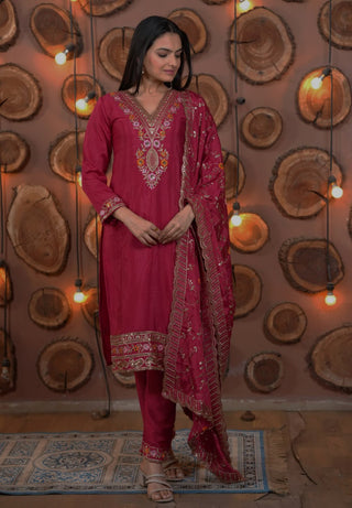 Vastranavya Wine Embroidery Work Shimmer Chiffon Saree with Unstitched Blouse
