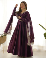 Teeya Creation Wine Color Pure Roman Silk Chanderi Party Wear Fully Stitched Gown This luxurious Anarkali gown is crafted from heavy Pure Roman Sil...