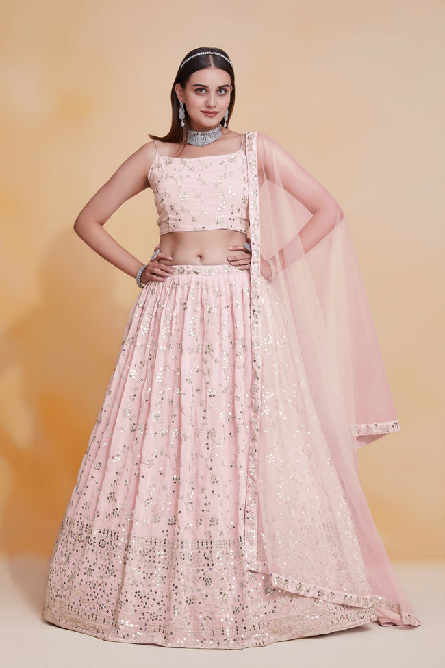 Pink Georgette Thread Sequence Embroidery Work Lehenga Choli - Jihu Culture