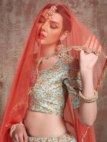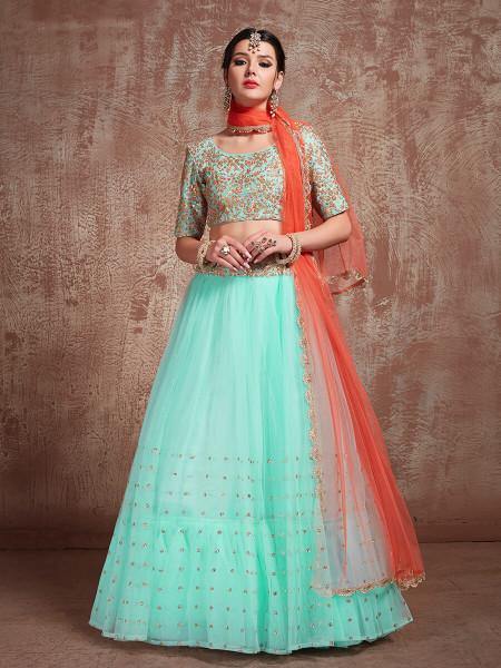 Blue Soft Net Heavy Embroidered Lehenga features a art silk blouse , soft net dupatta and soft net Lehenga. Embroidery is completed with Sequins, Thread & Zari. This style is made in India and checked by hand to ensure high quality.