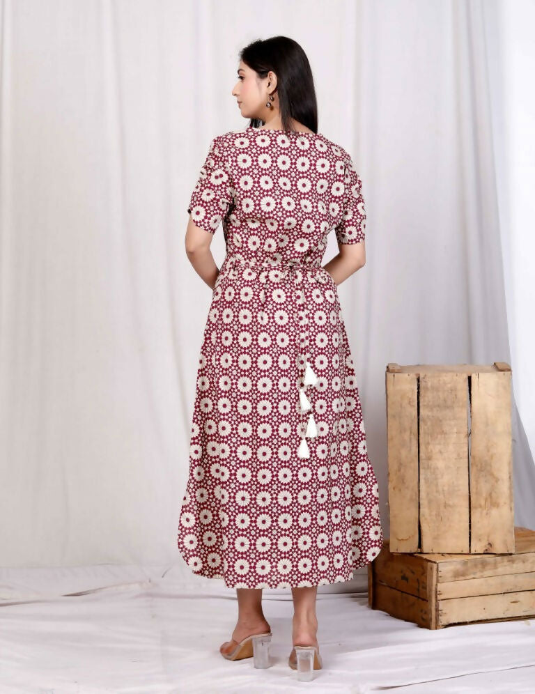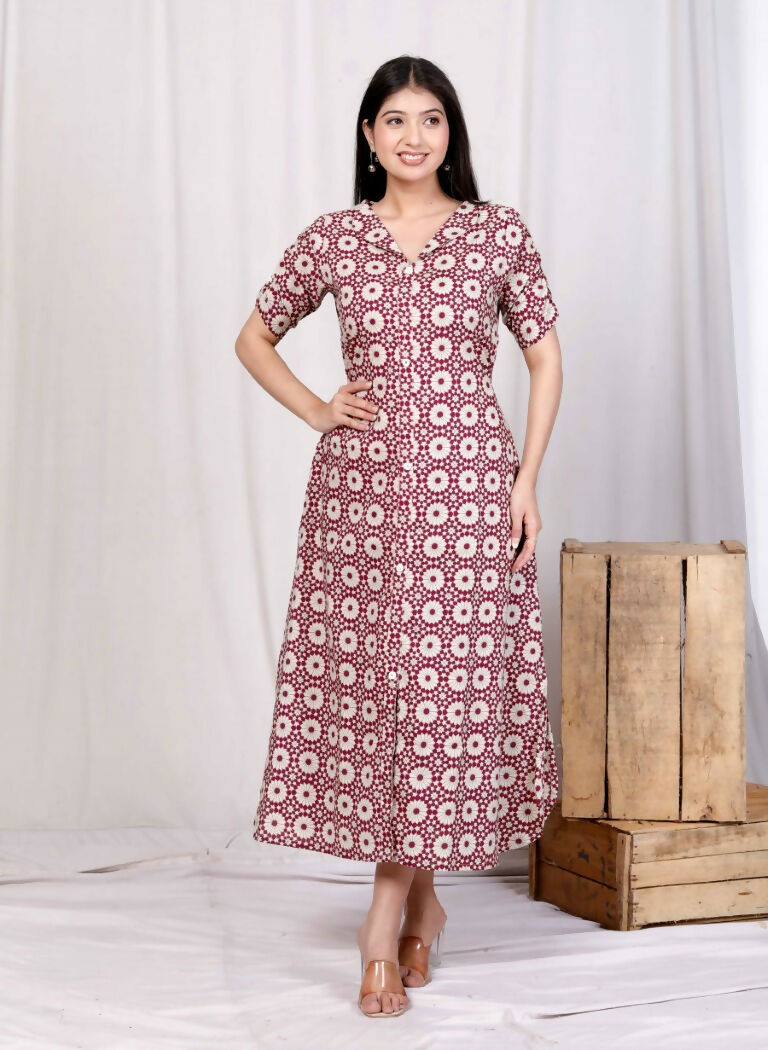 Make your way to the world of comfort and ethnic fun by wearing this floral print cotton A-line Maxi dress from Miravan. Crafted using Cotton material, it features slip on closure and Collar neck design. Handcrafted In A Floral Patterns, This Button-Down Dress Is Made With Both Style And Comfort In Mind. The A-Line Silhouette Offers A Flattering Fit For All Body Types, While The Button-Down Design Adds A Contemporary Edge. Featuring Elegant Elastic Details At The Sleeves, It Comes With A Same-Coloured Cotton Slip. Whether You're Heading To The Office, Brunch With Friends, Or A Casual Outing, This Miravan Printed Dress Is Your Go-To Choice For Effortless Chic Style.