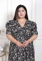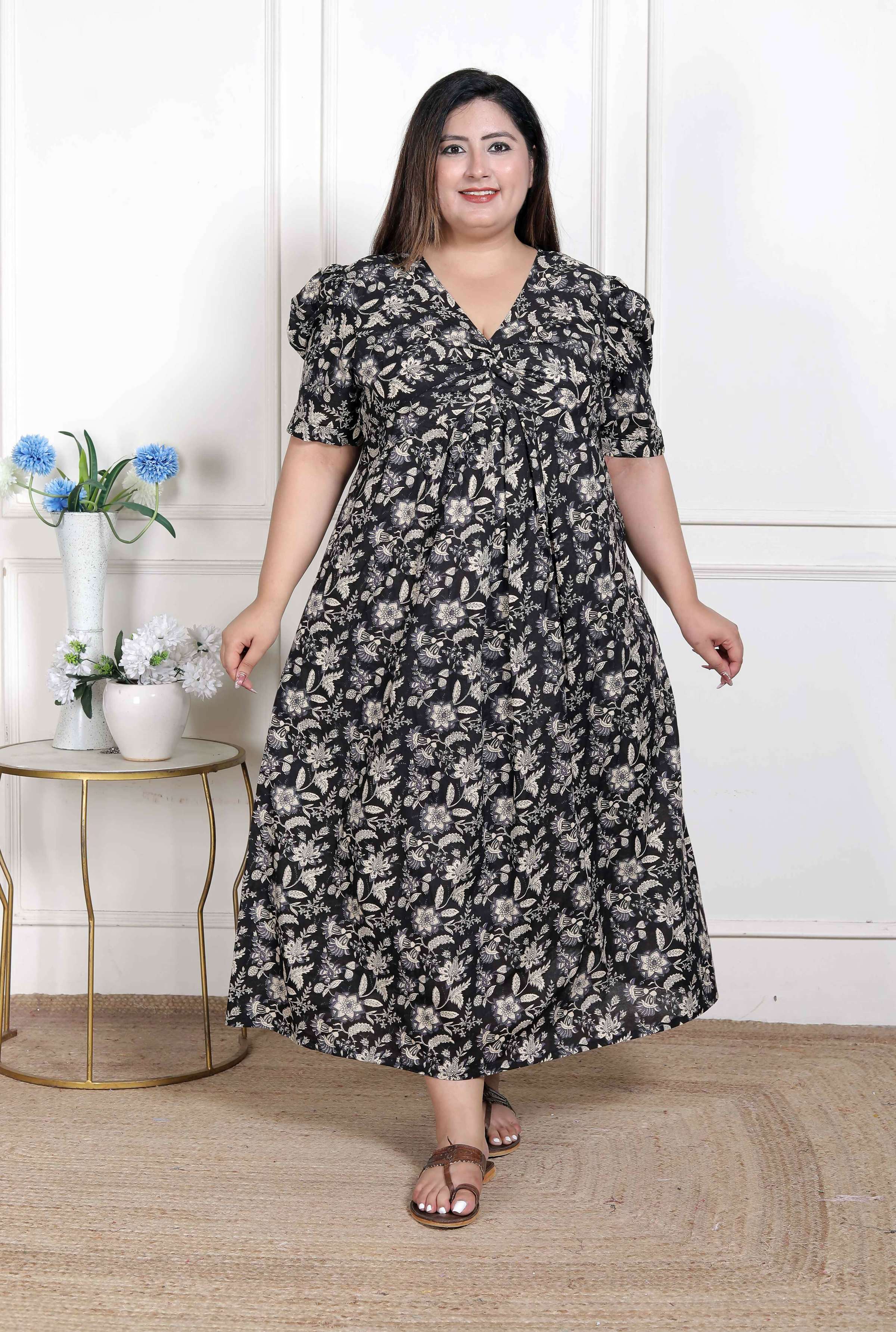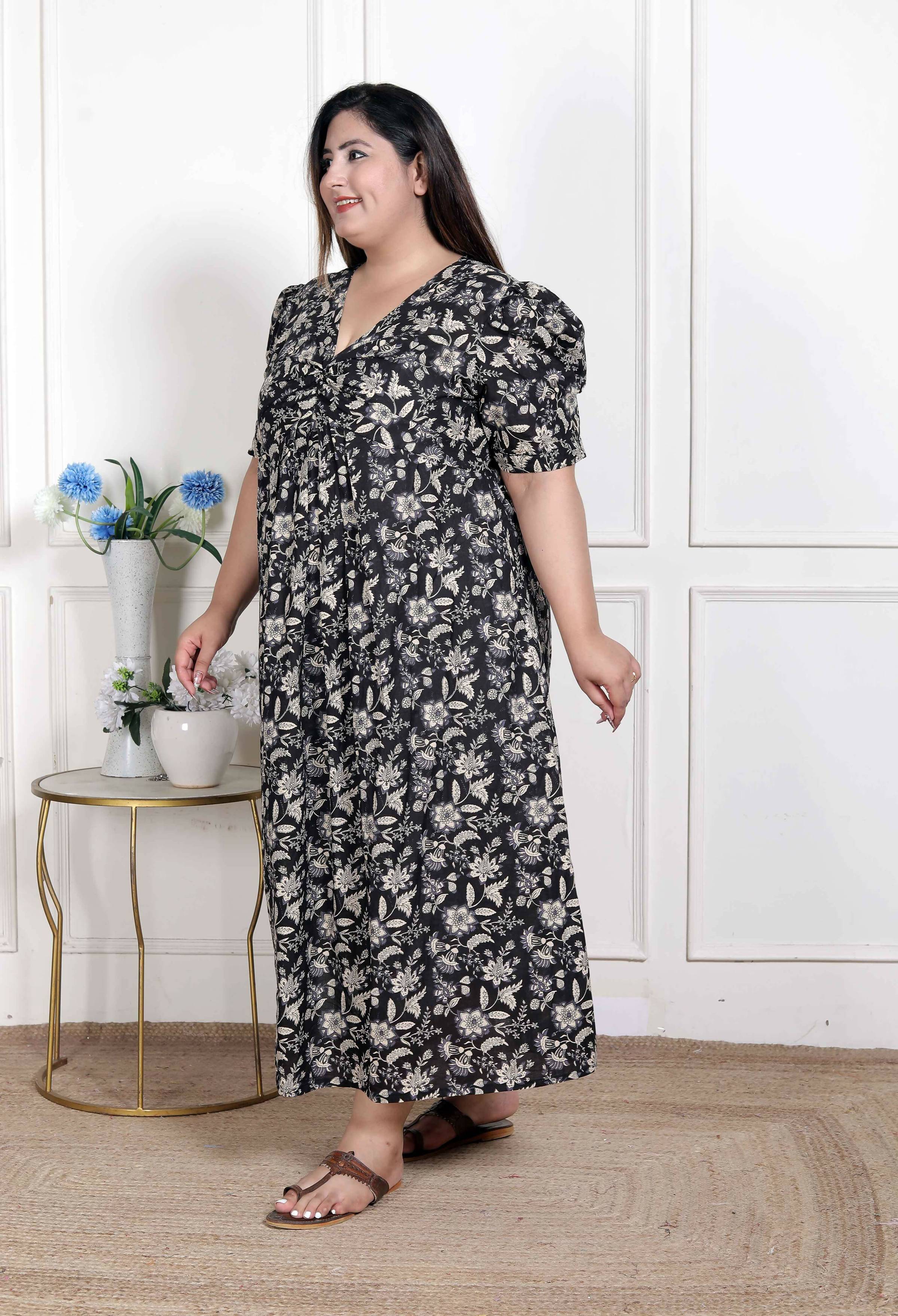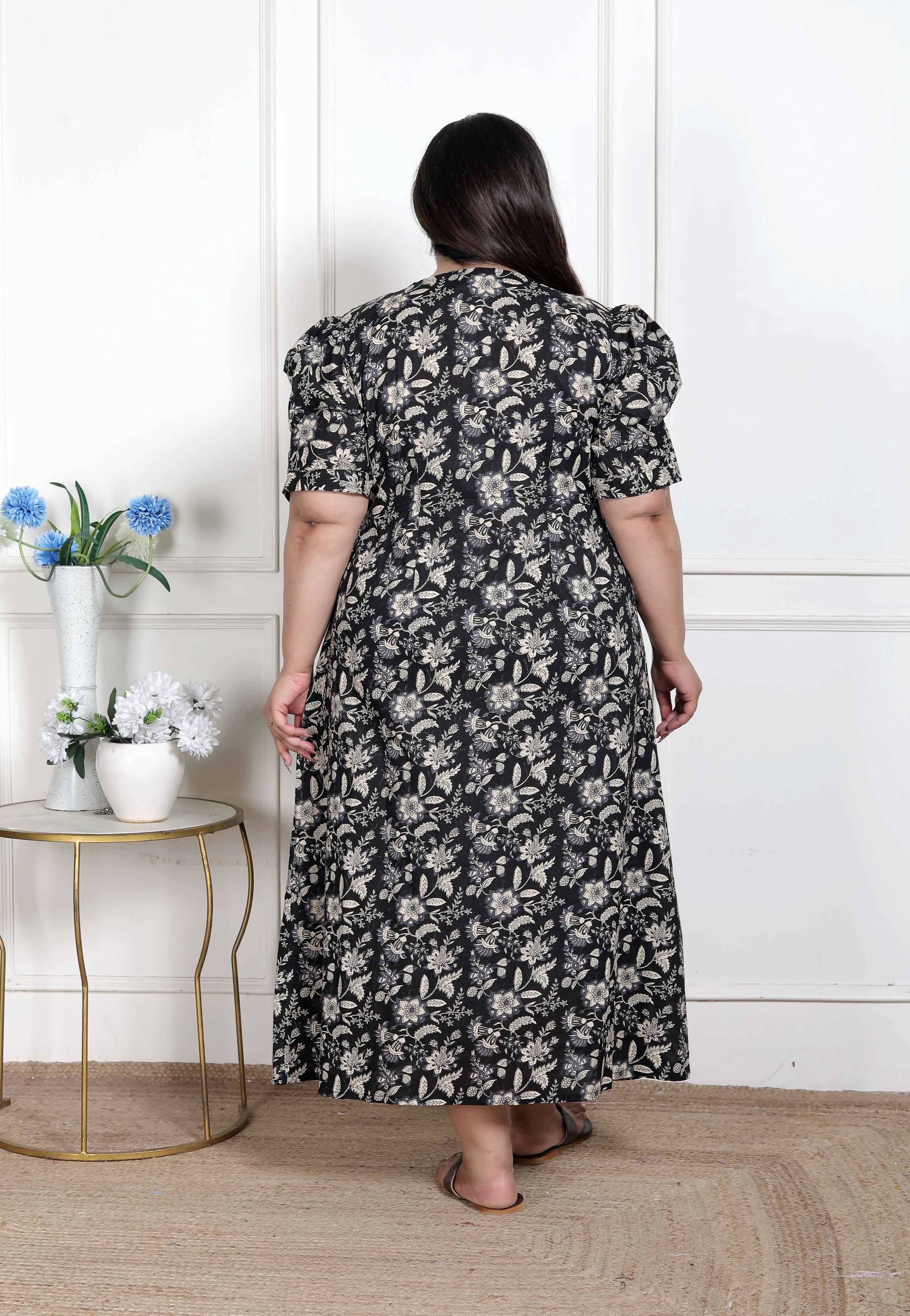 Miravan Women's Plus Size Pleated Puff Sleeve Floral Pure Cotton Black And White Butterfly Maxi DressAbout the product:Make an endearing choice for...
