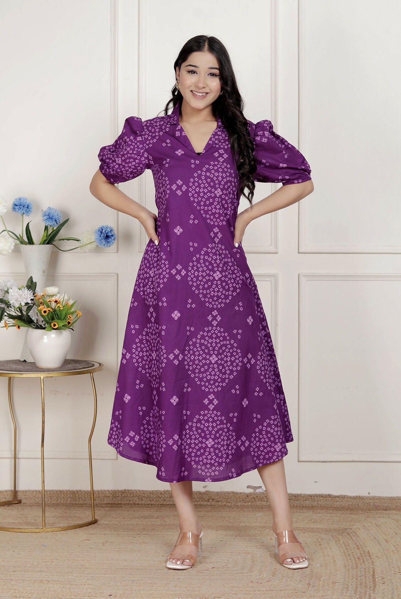 Stay stylish with this Purple dress from miravan. Made from high quality cotton, it features pull on closure and Bandhani printed along with half sleeves & Collar neck design. Pair it with sneakers with minimal jewellery to complete your ensemble.