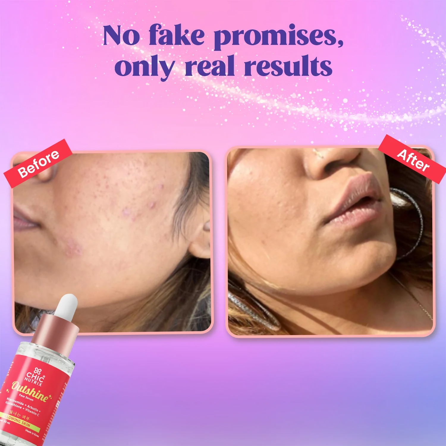 • Chicnutrix Outshine - glutathione + vitamin C Korean brightening serum is sourced from Korea especially designed for Indian skin. It has added benefits of niacinamide, arbutin and triple hyaluronic acid complex to achieve soothing, supple and hydrating skin. When used in combination, the glutathione supplement and the brightening serum work hand in hand to amplify their individual benefits. The supplement works internally to inhibit the melanin synthesis, fighting pigmentation and improve overall skin health from within, while the serum delivers targeted, external support to fade dark spots while enhancing your skin's radiance. It is dermatologist approved and is suitable for all skin types.