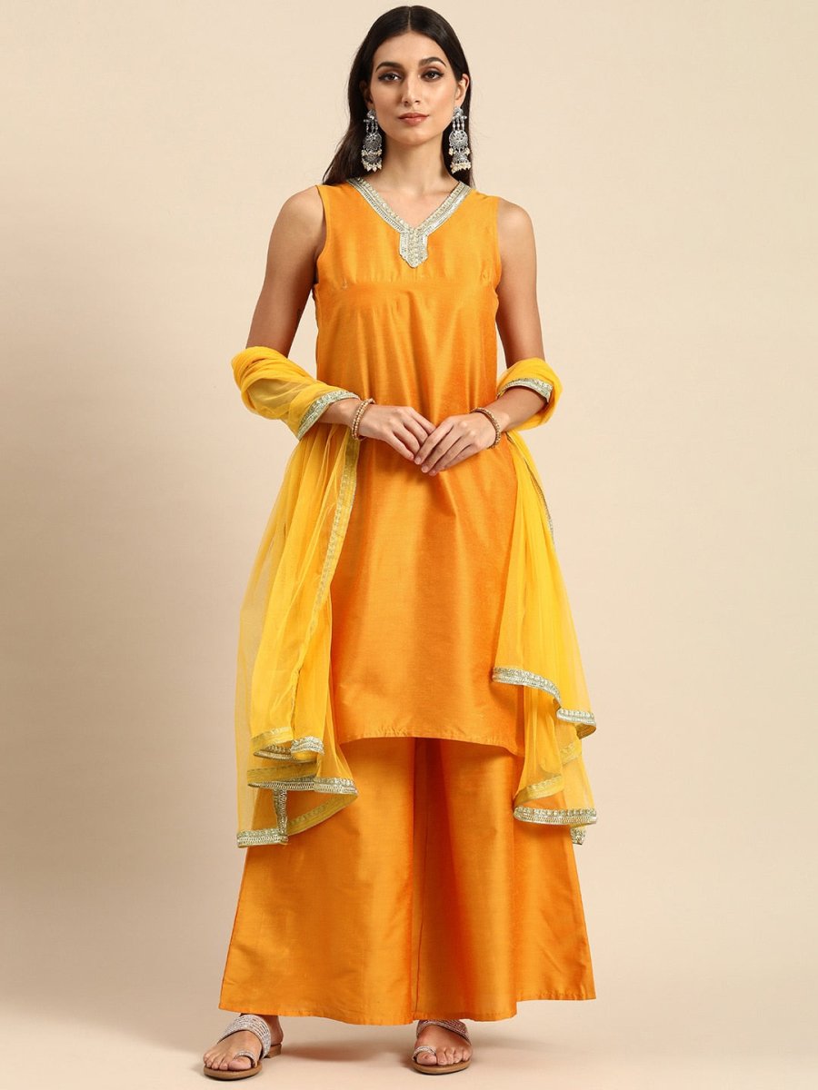All About You Women Mustard Yellow Ethnic Motifs Embroidered Gotta Patti Kurta with Palazzos & With Dupatta Product Details Mustard yellow e...