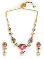 22K Gold toned handcrafted necklace set features rich Kundan work and delicate Meenakari detailing. A striking pink pendant with a floral motif takes center stage, accented by pearls and green enamel. Teardrop-shaped green stones and matching earrings complete the look with a touch of regal charm, perfect for weddings and festive occasions. Secured with an adjustable drawstring closure. Anti-tarnish and hypoallergenic for lasting shine and comfort.