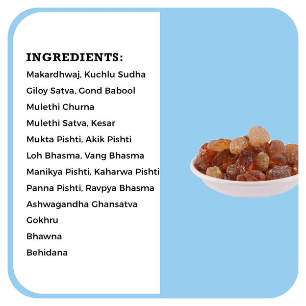 Key Ingredients– Makardhwaj, Kuchlu Sudha, Giloy Satva, Gond Babool, Mulethi Churna, Kesar, Mukta Pishti, Akik Pishti, Loh Bhasma, Vang Bhasma, Manikya Pishti, Kaharwa Pishti, Panna Pishti, Raupya Bhasma, Ashwagandha Ghansatva, Gokhru, Behidana.