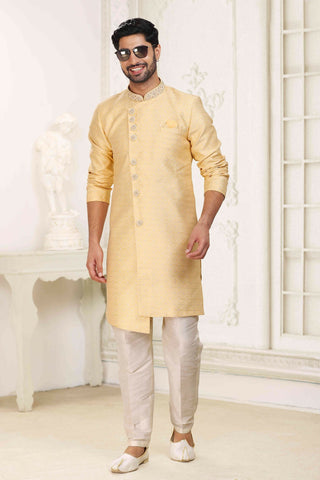 Raivat Ethnic Banarasi Jacquard Embroidery Semi Indo Western Sherwani In Yellow Colour