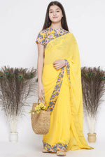 Little Bansi Floral Print Ready To Wear Saree And Floral Blouse - Yellow